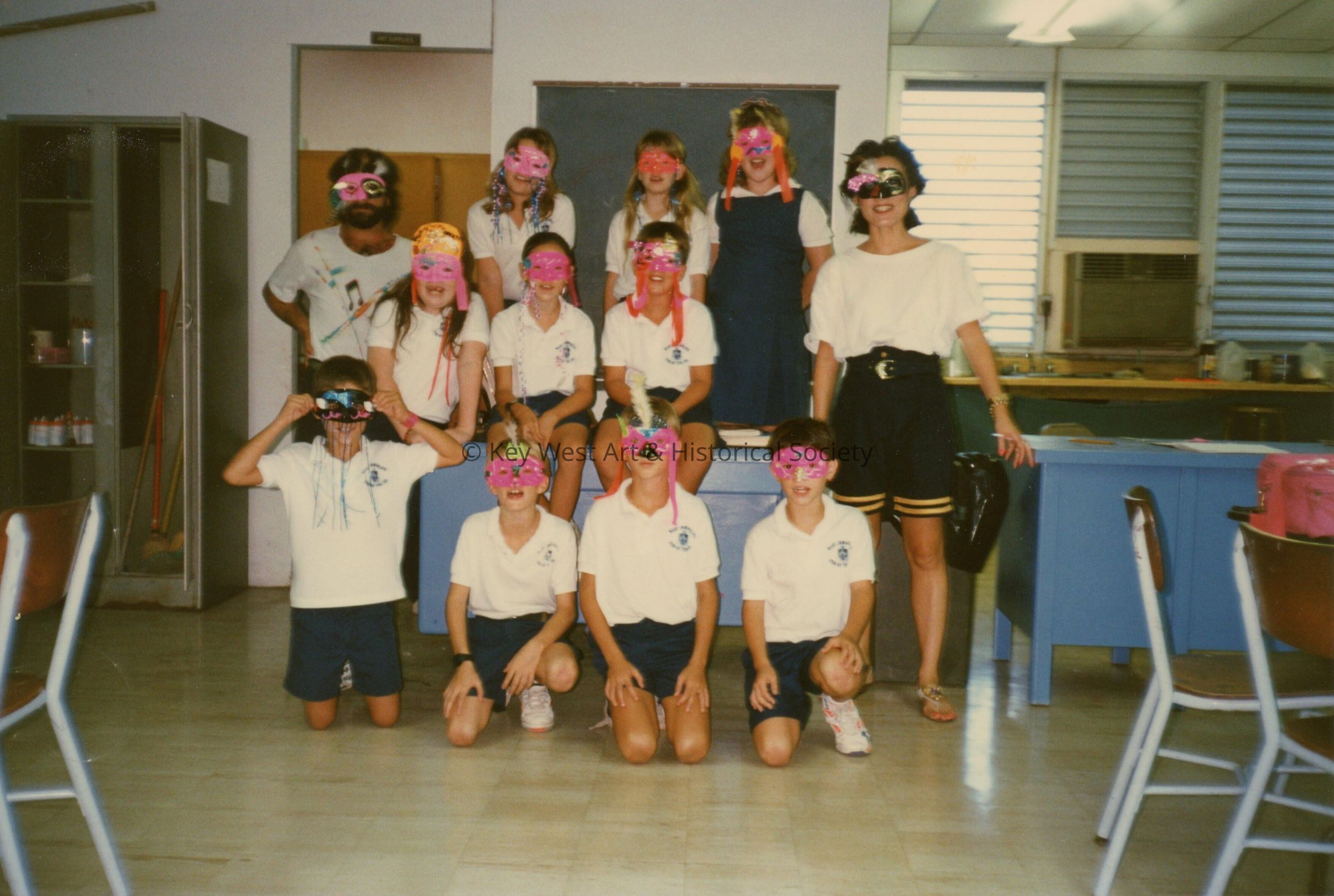 A group of unknown school kids with two unknown adults all wearing face mask.Entry/Object ID