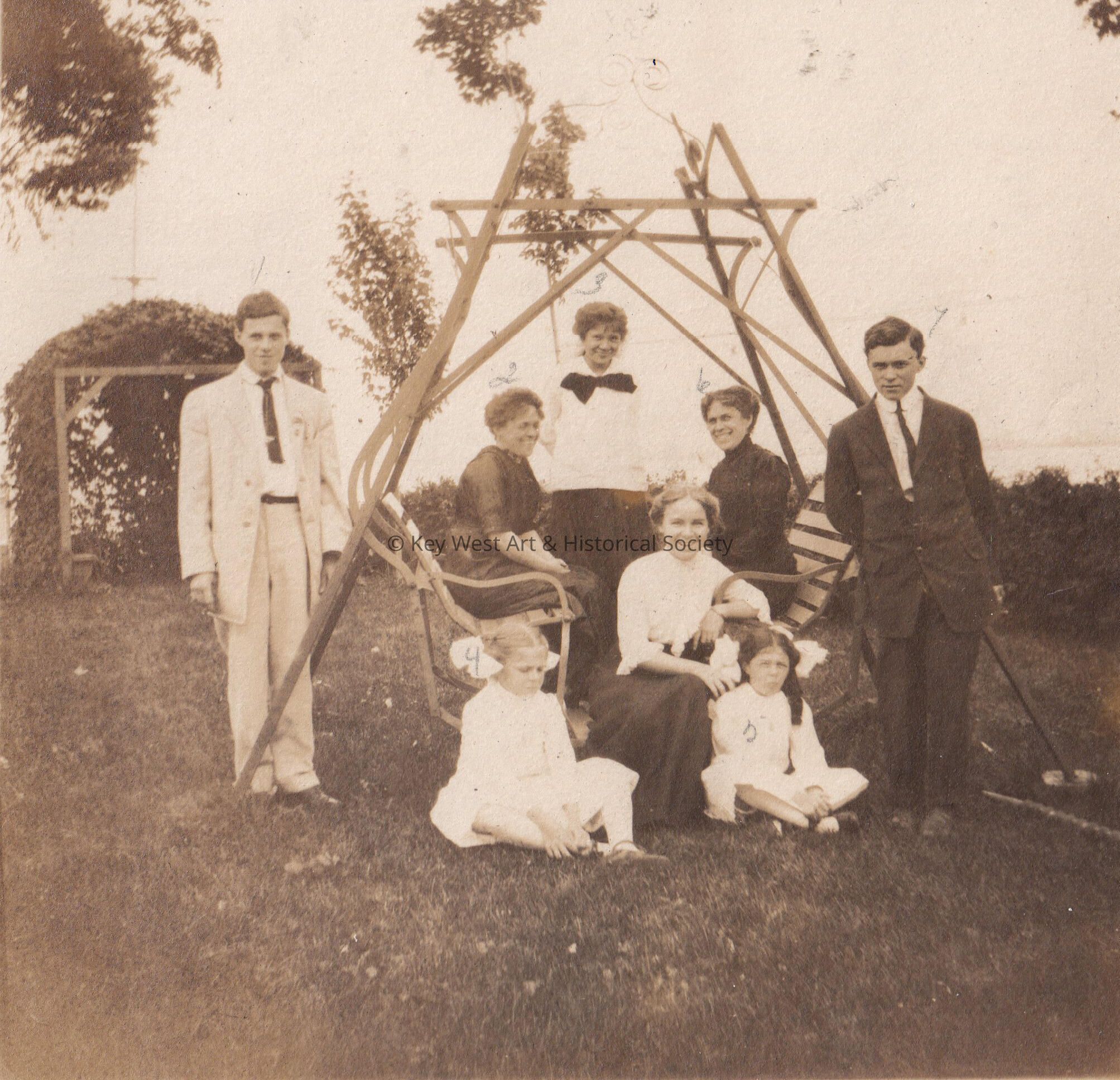 A group on a glider: Robert (Alice's younger brother), Alice's aunt, Alice's cousin, Mrs. Borssian, and Lewis (Alice's older brother).Collection