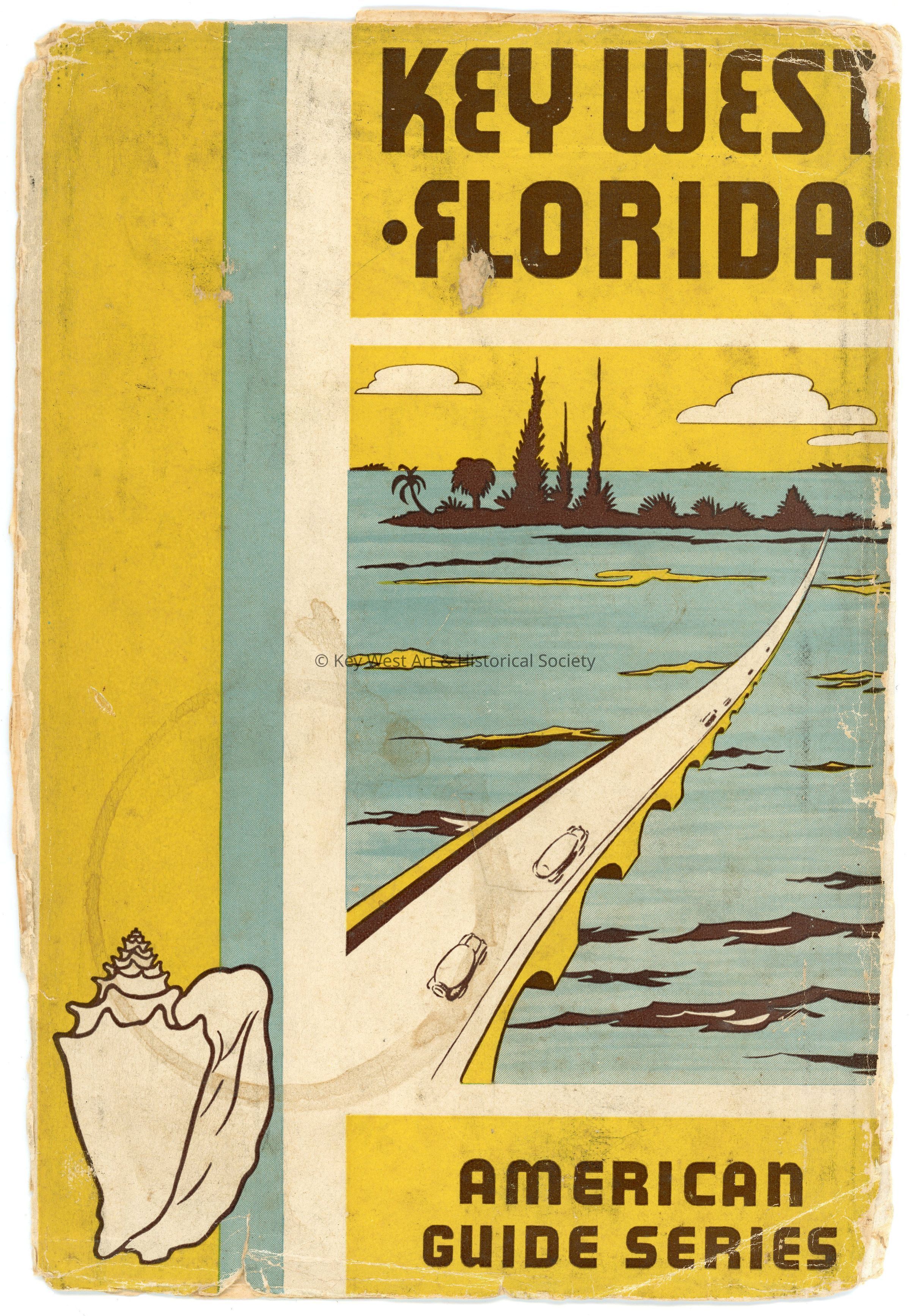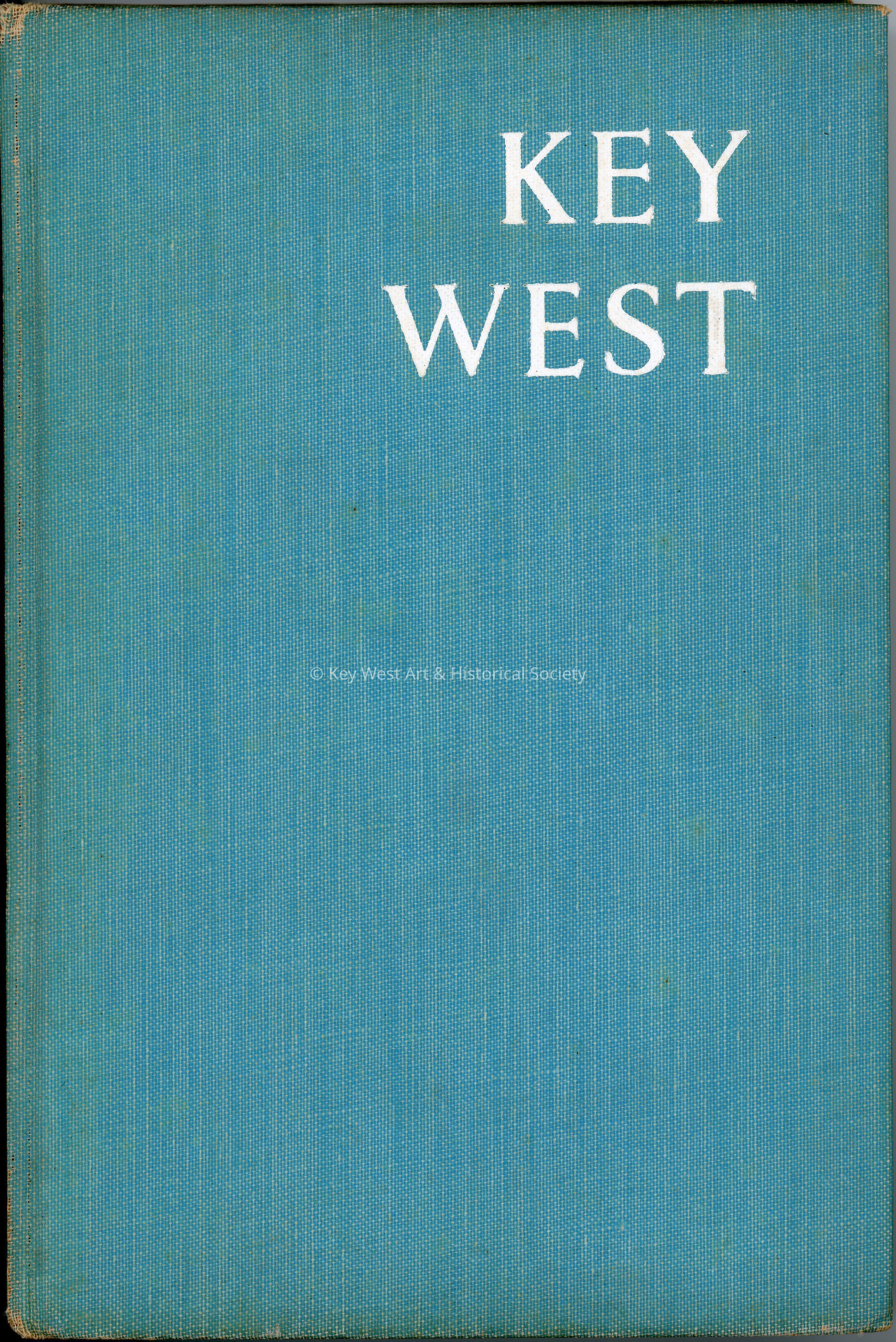 Hard cover book with a yellow, blue, and white dust jacket. The book has a blue buckram textile cover with 'Key West' in white text in the upper right front cover. The contents consist of a tourist guidebook with a chronology and black and white photographs of Key West.Collection