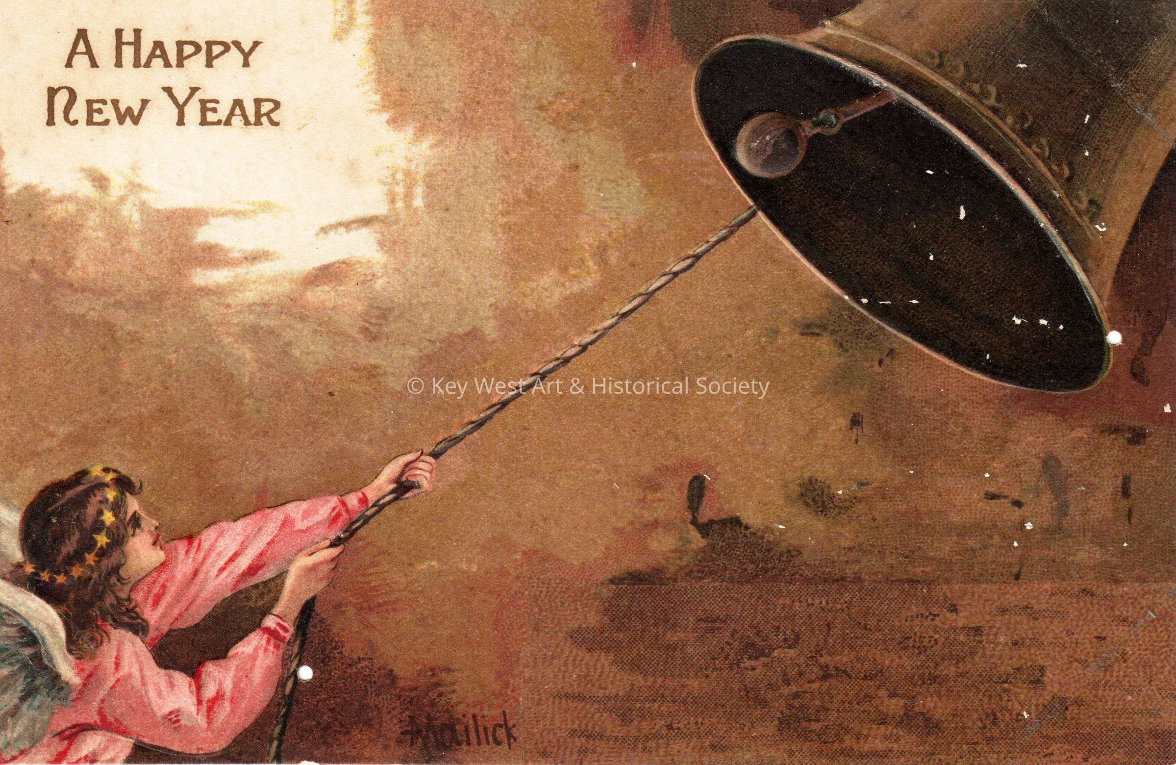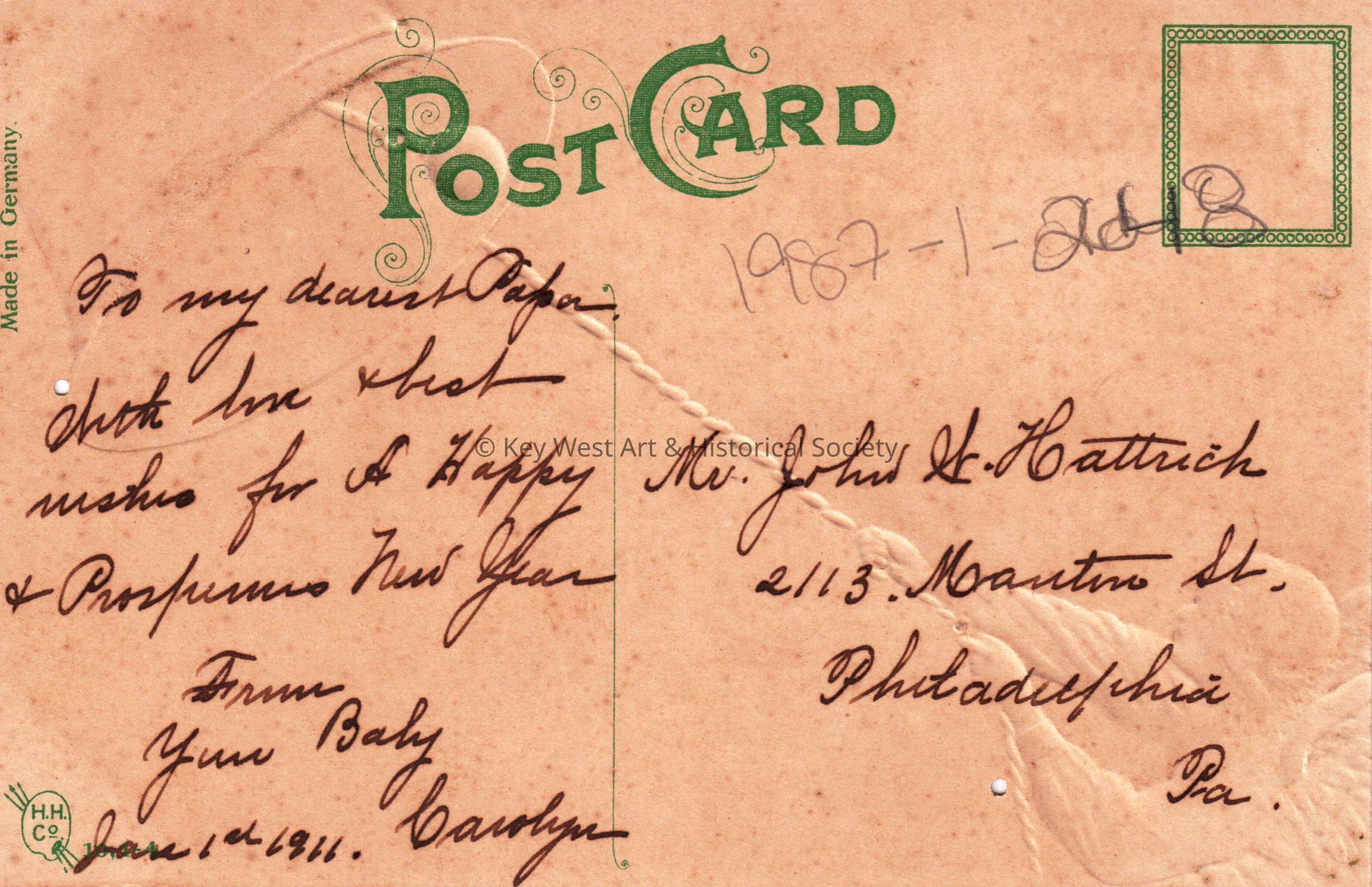 Postcard depicting an angel ringing a bell. The caption reads, ‘A Happy New Year’. The message on the verso reads, ‘To my dearest Papa, with love and best wishes for a Happy and Prosperous New Year. From your baby, Carolyn, January 1, 1911.’ The card is addressed to Mr. John W. Hattrick, 2113 Manton Street, Philadelphia, Pennsylvania.Collection