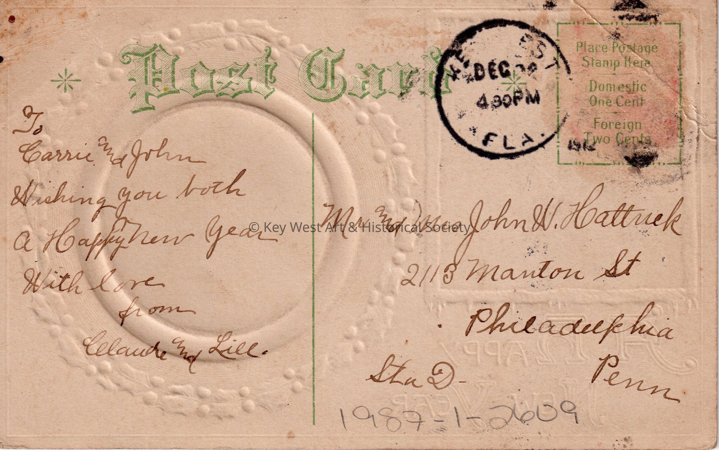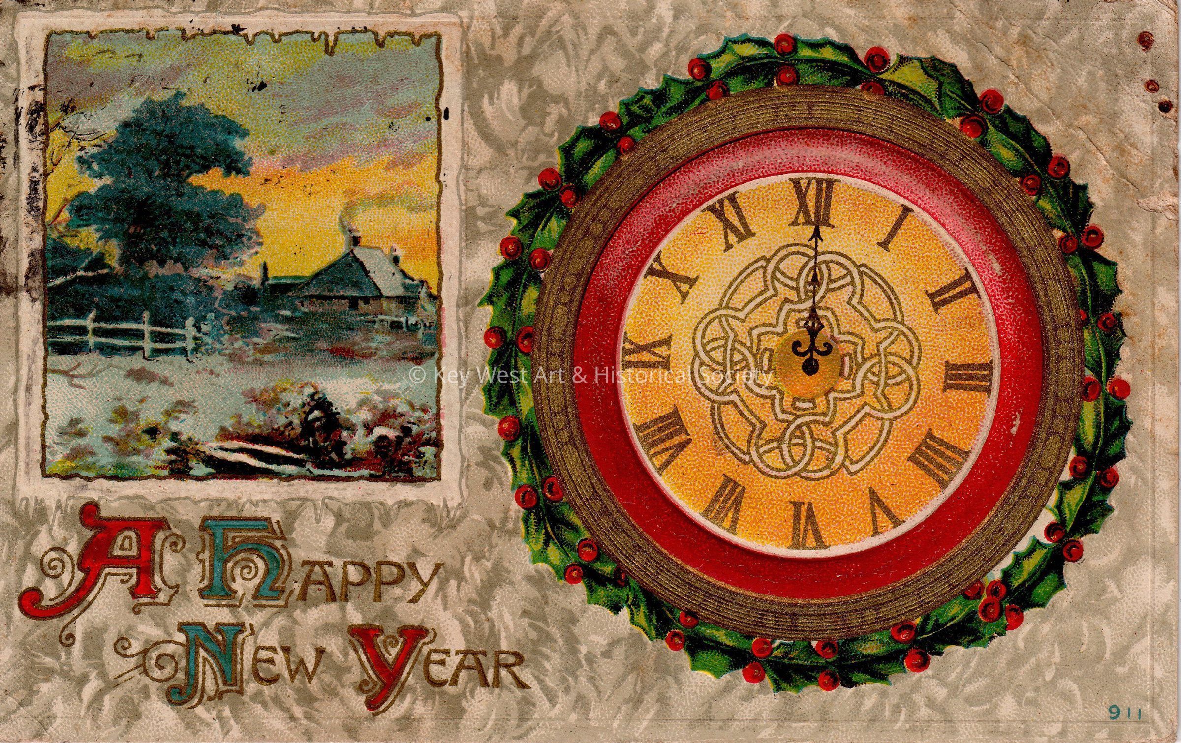 Postcard depicting a clock showing midnight surrounded by holly leaves near a painting of a house. The caption reads, ‘A Happy New Year’. The message on the verso reads, ‘To Carrie and John, Wishing you both a Happy New Year. With love from Claude and Lill’. The card is addressed to Mr. and Mrs. John W. Hattrick, 2113 Manton Street, Philadelphia, Pennsylvania, Station D, and is postmarked Key West, December 23, 1912.Collection