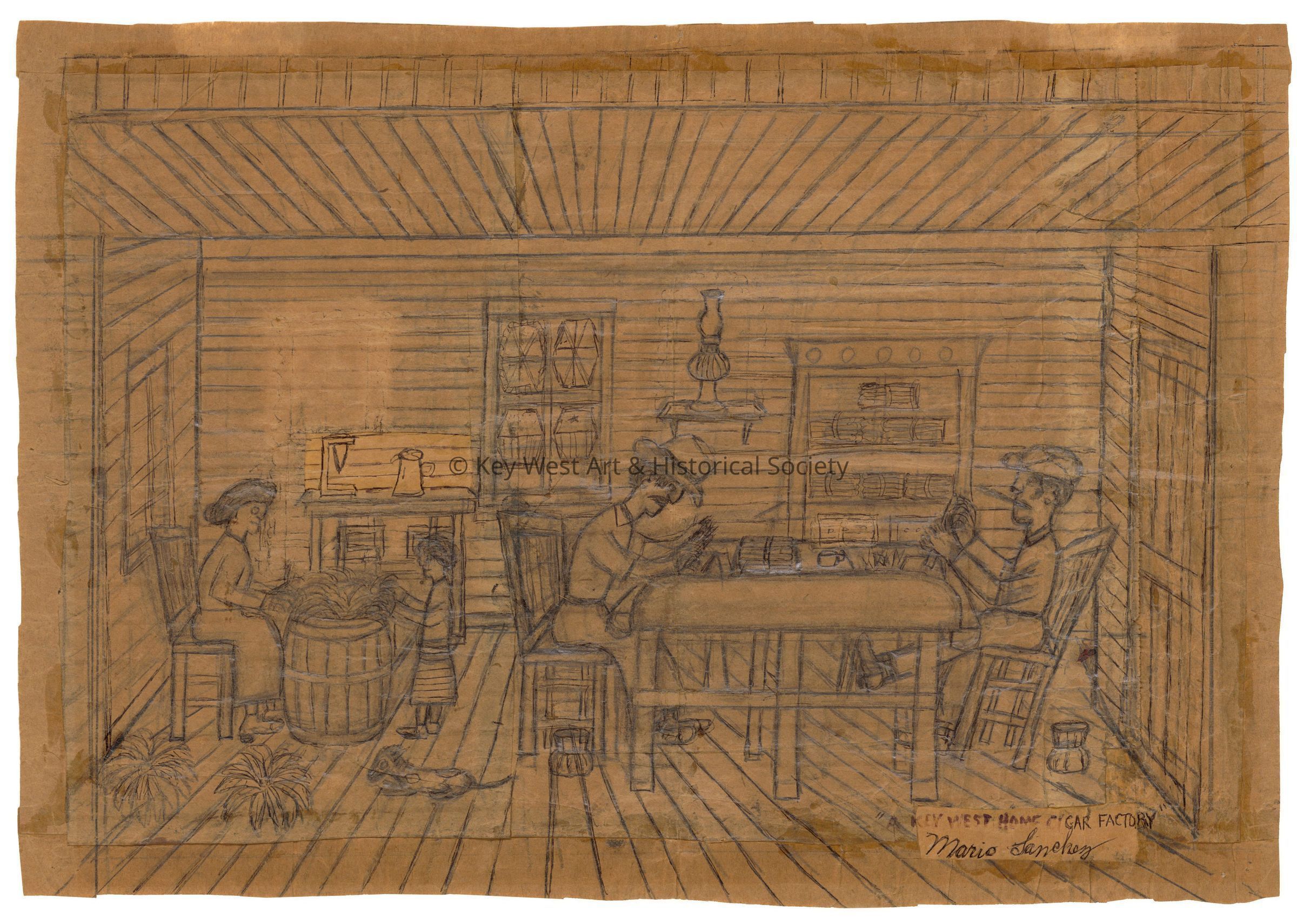 Pencil drawing on an unfolded paper bag by Mario Sanchez depicting two cigar makers sitting at a table rolling cigars. A woman and child are gathered around a barrel stripping tobacco leaves.