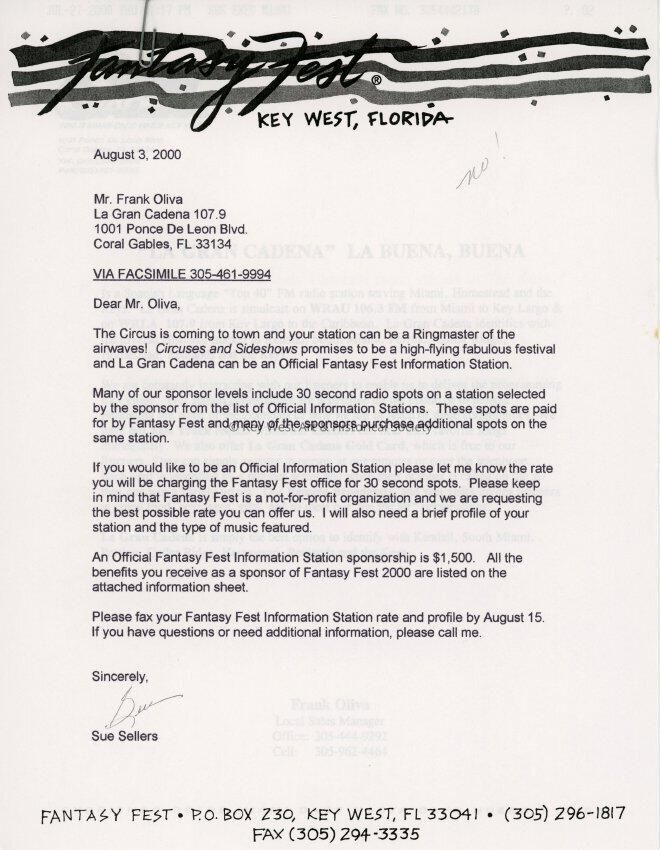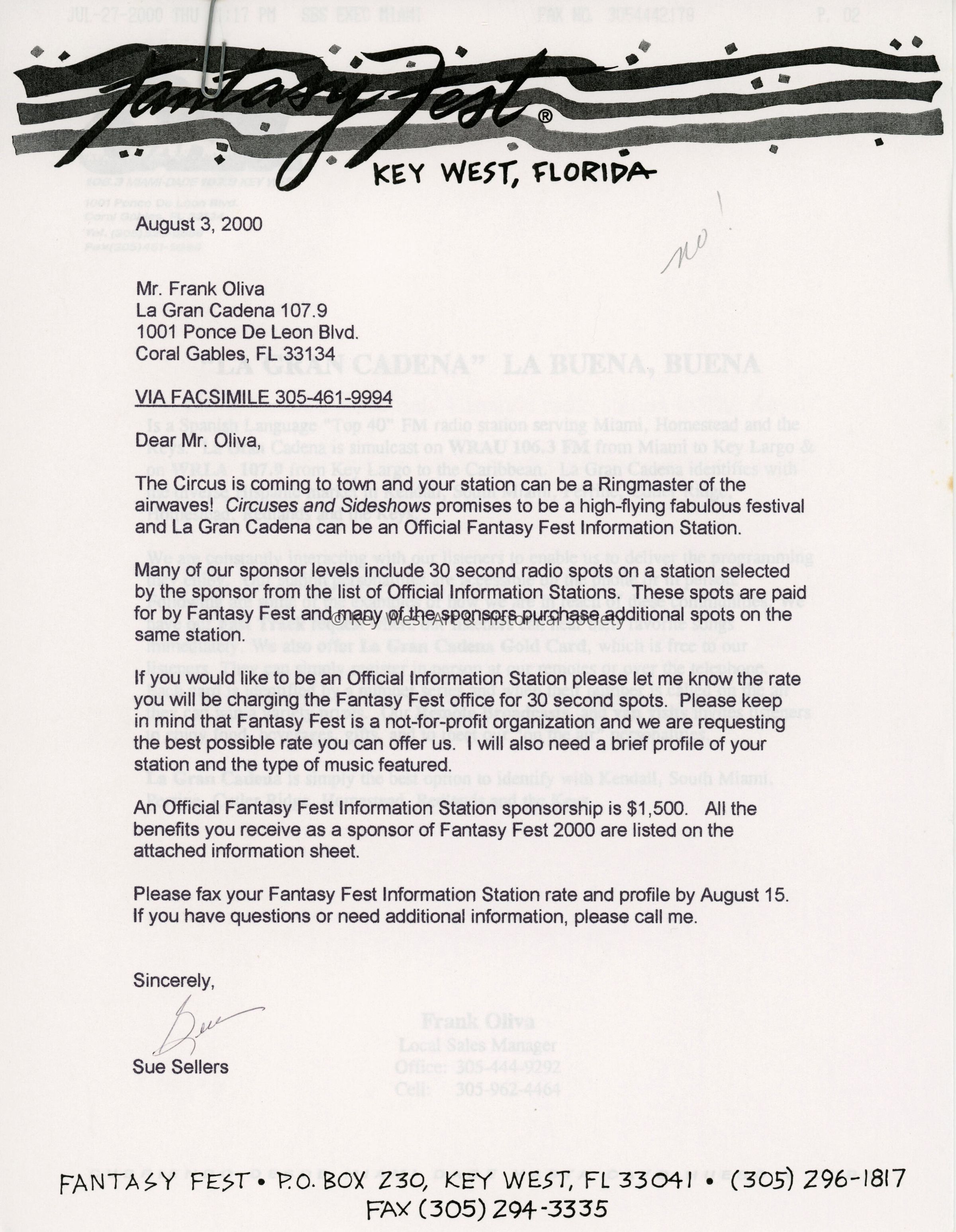 A letter to Frank Oliva from 107.9 from Sue Sellers about radio time.