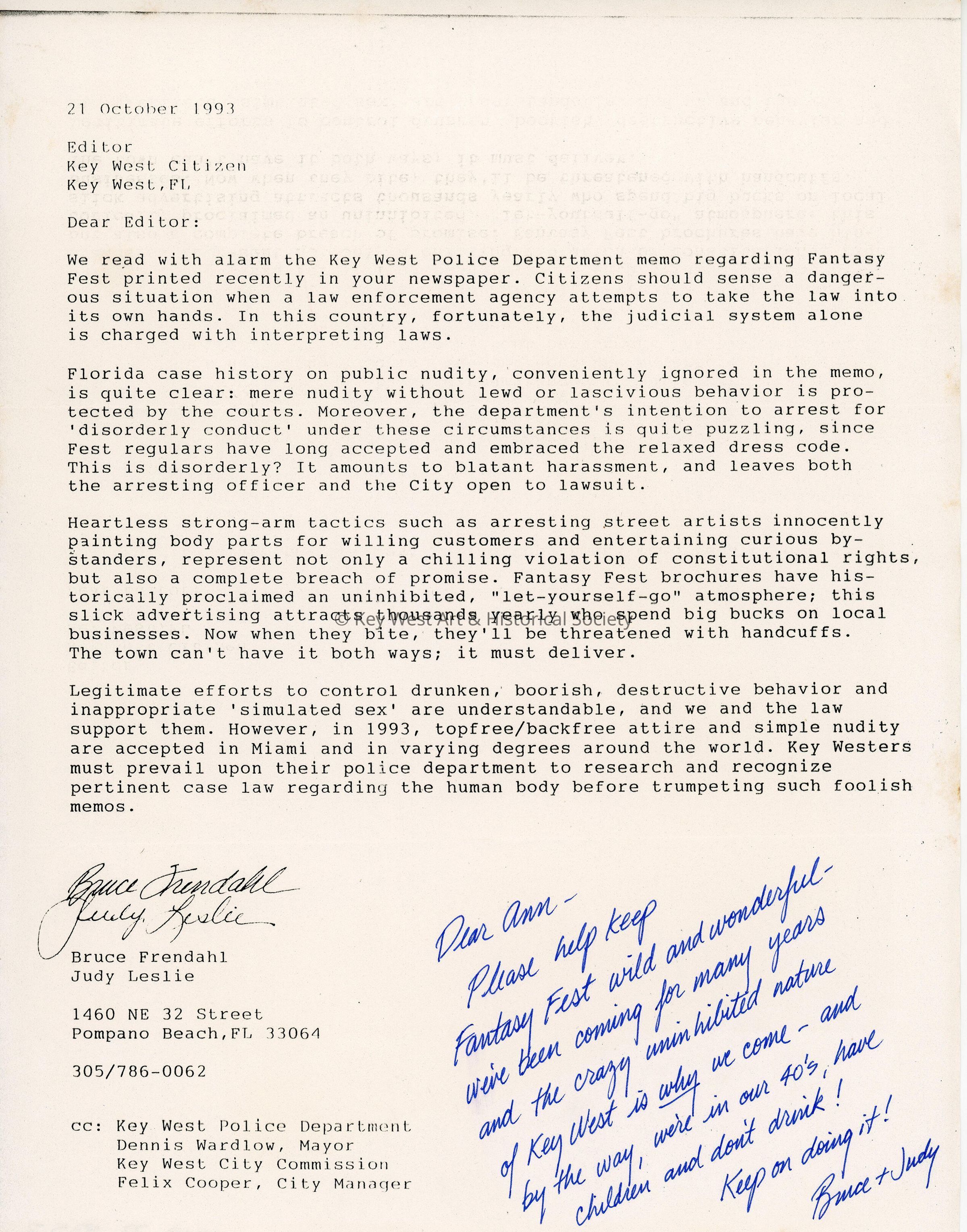 A letter to the editor of the Key West Citizen from Bruce Frendahl and Judy Leslie.