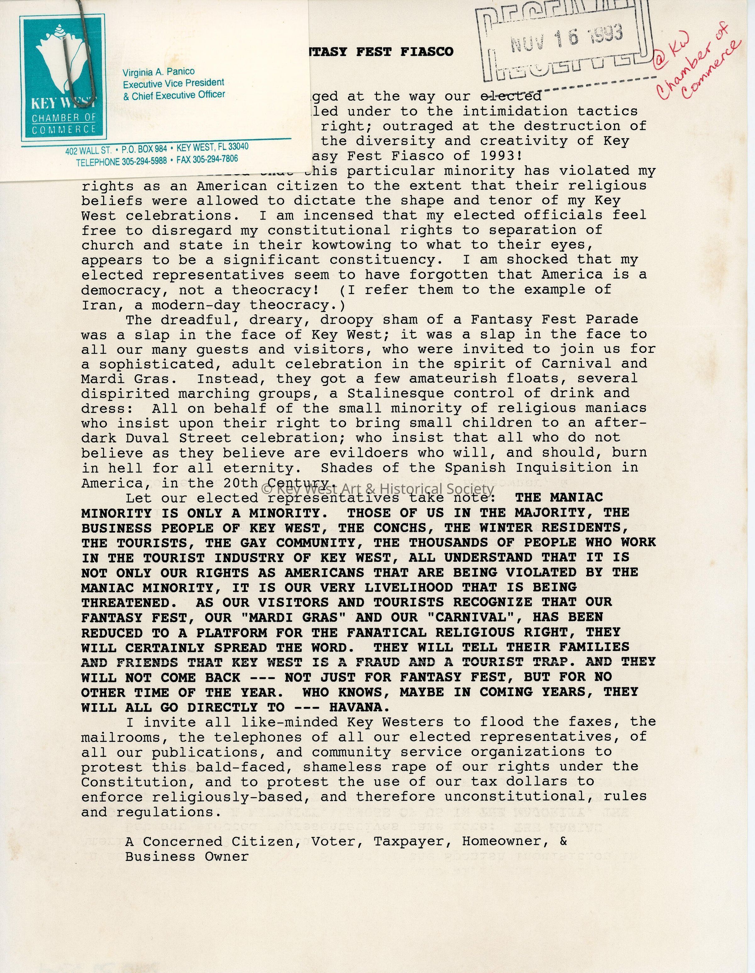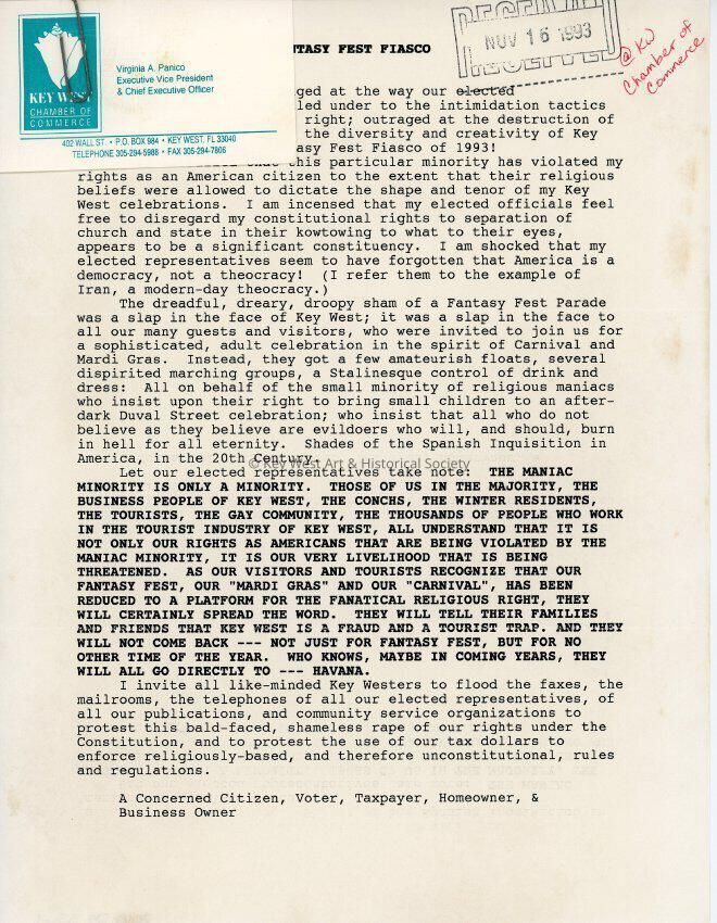 A letter to the Fantasy Fest committee from a concerned citizen, voter, taxpayer, homeowner, and business owner.Entry/Object ID