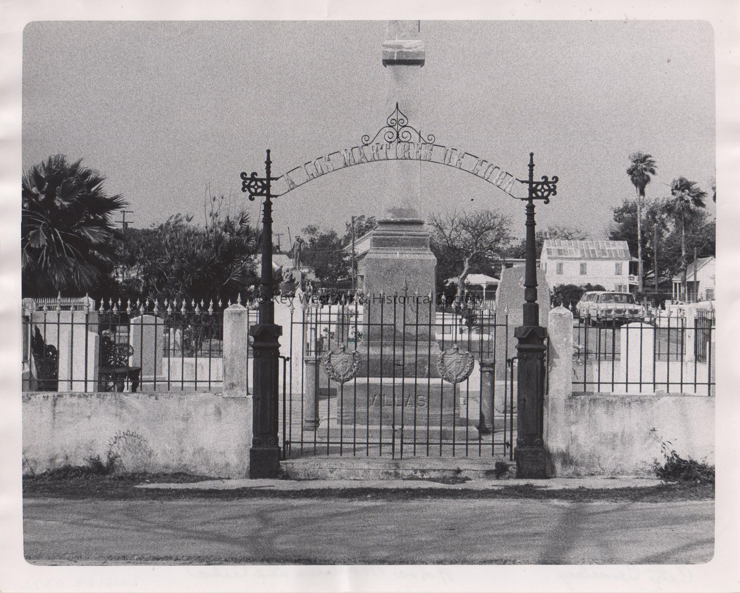 Black and white photograph of the 'A Los Martires de Cuba' plot at the Key West Cemetery.