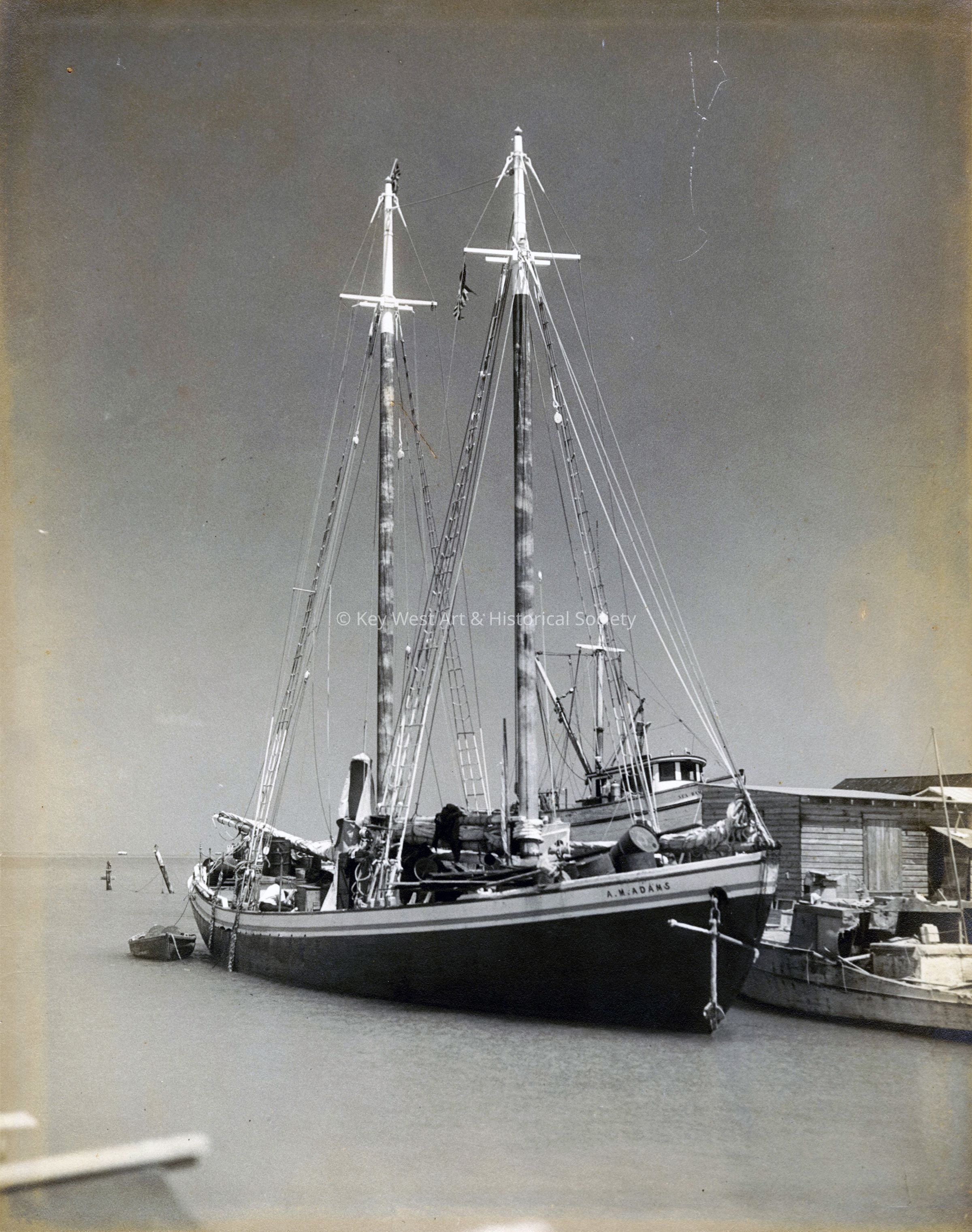 Black and white photograph of the turtle schooner A. MAITLAND ADAMS at Thompson Docks in the Key West Bight. The schooner is also listed as A. M. ADAMS in other sources.