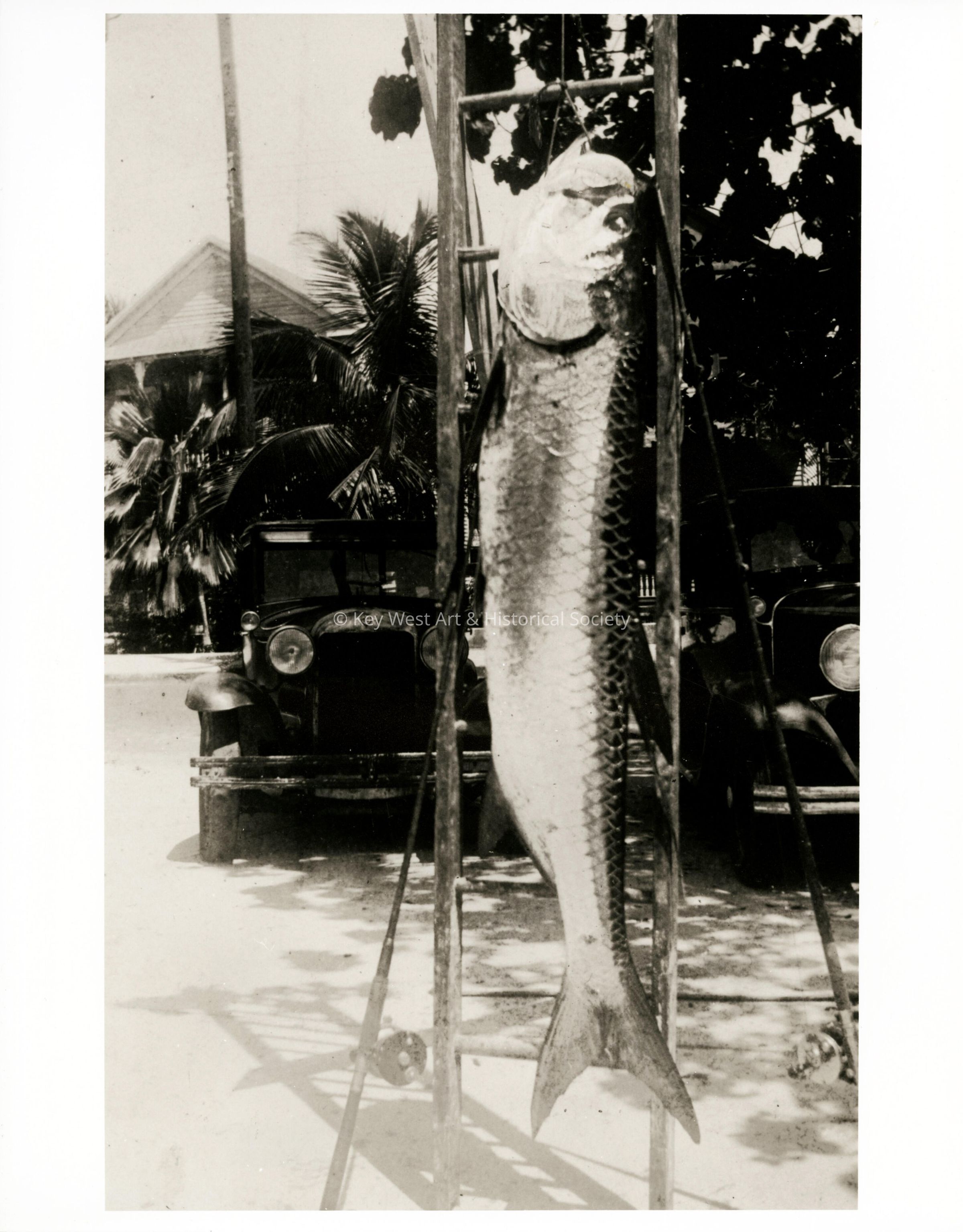 Black and white photograph of a large tarpon hanging from a ladder with a fishing rod alongside.