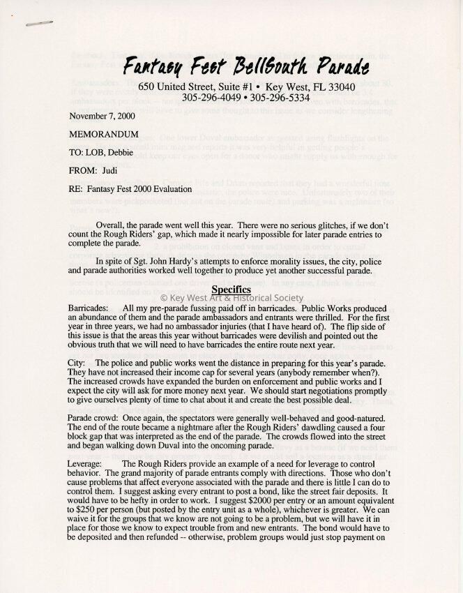 A memo to Lob and Debbie from Judi of a Fantasy Fest evaluation.