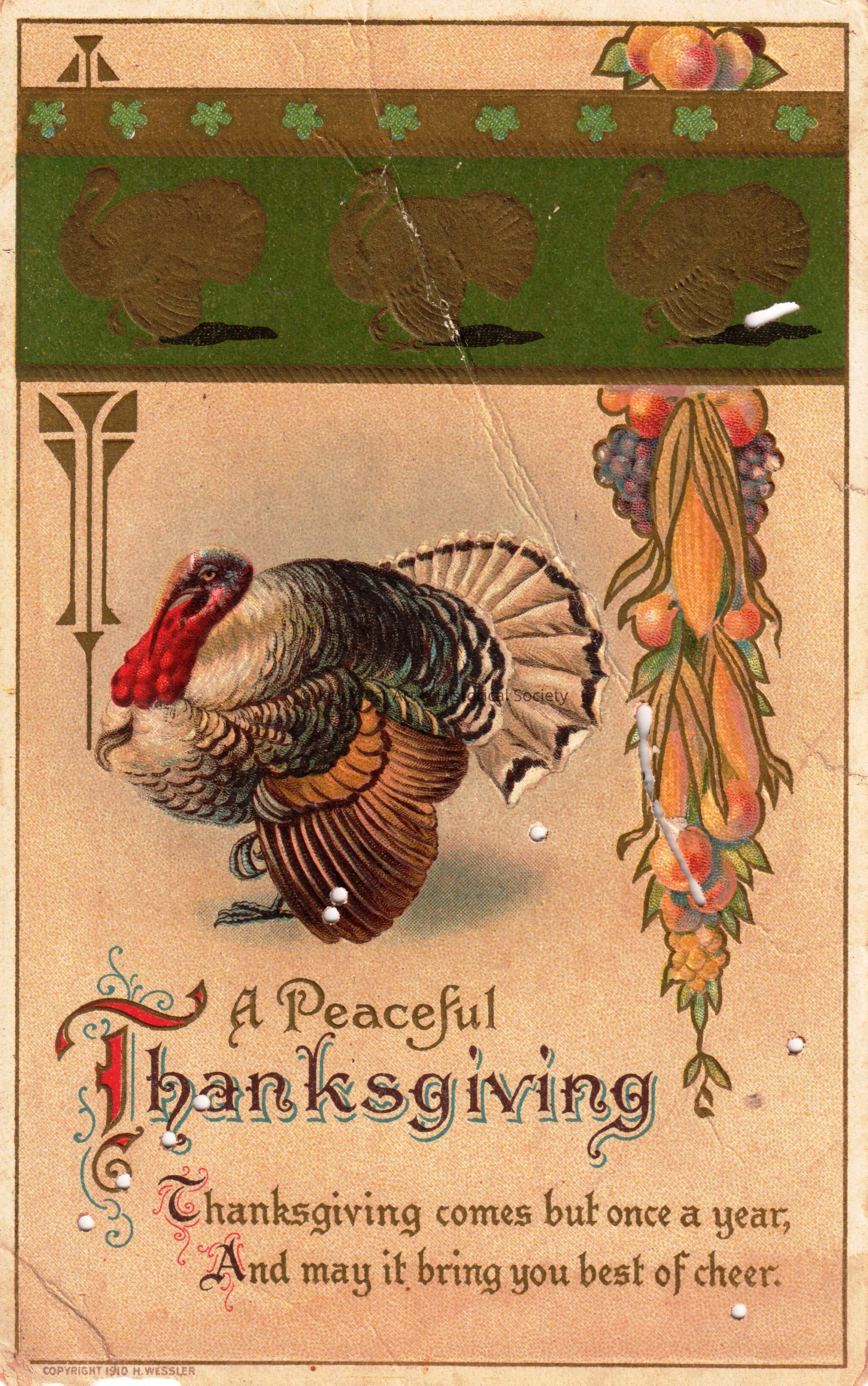 Postcard depicting a turkey, corn, and fruit. The caption reads, ‘A Peaceful Thanksgiving. Thanksgiving comes but once a year, and may it bring you best of cheer’.Collection