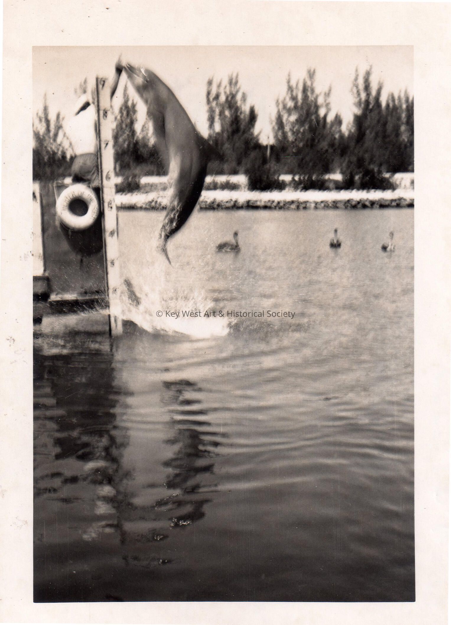 Black and white photograph of porpoise feeding time at Theater of the Sea.