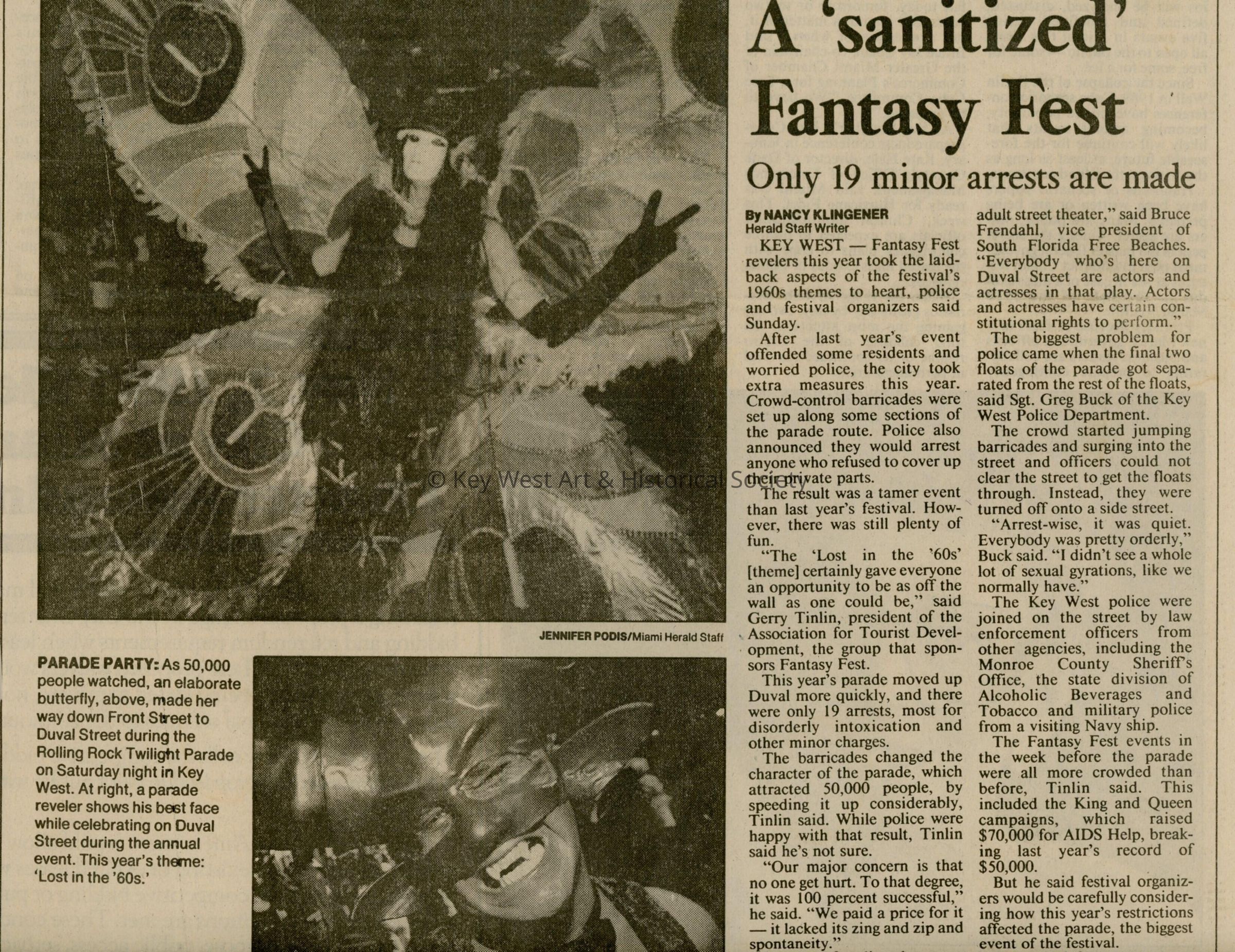 An newspaper clipping from the Miami Herald titled 'A "sanitized" Fantasy Fest.'