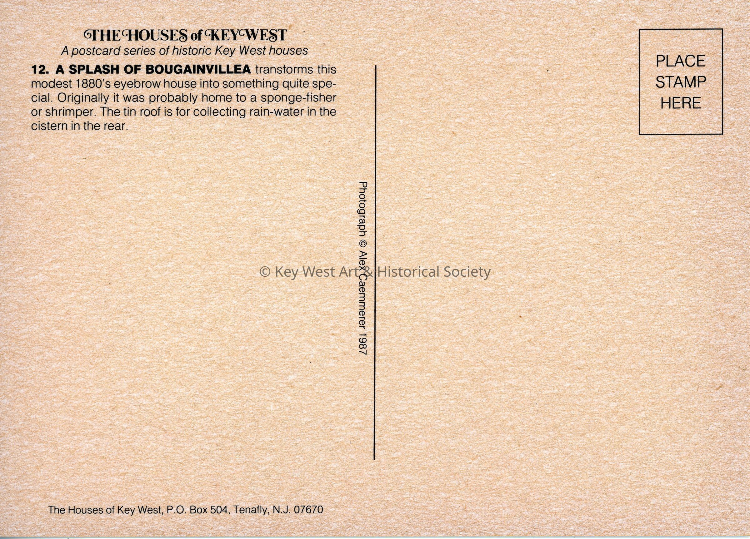 Postcard belonging to 'The Houses of Key West' series depicting a Conch House with a large flowering vine growing over the fenced entryway. Notation on verso reads '12. A SPLASH OF BOUGAINVILLEA transforms this modest 1880's eyebrow house into something quite special. Originally it was probably home to a sponge-fisher or shrimper. The tin roof is for collecting rain-water in the cistern in the rear.'
