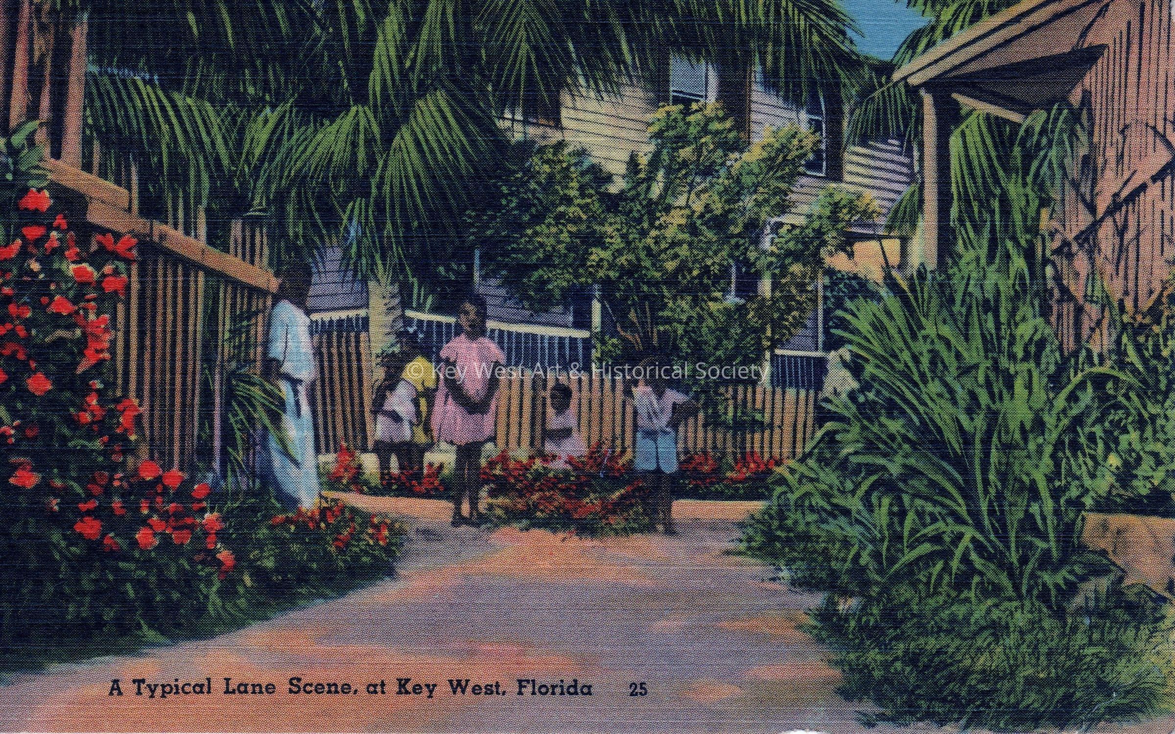 Postcard depicting children in the street. The caption reads, ‘A typical lane scene at Key West, Florida’. The description on the verso reads, ‘From the little streets and alleys picturesque and colorful, we get glimpses of the old Key West and at night the rhythm of bombs, clavas, and guitars enlivens the evening air as Cubano and Spaniard chant their impassioned folk songs.‘Collection
