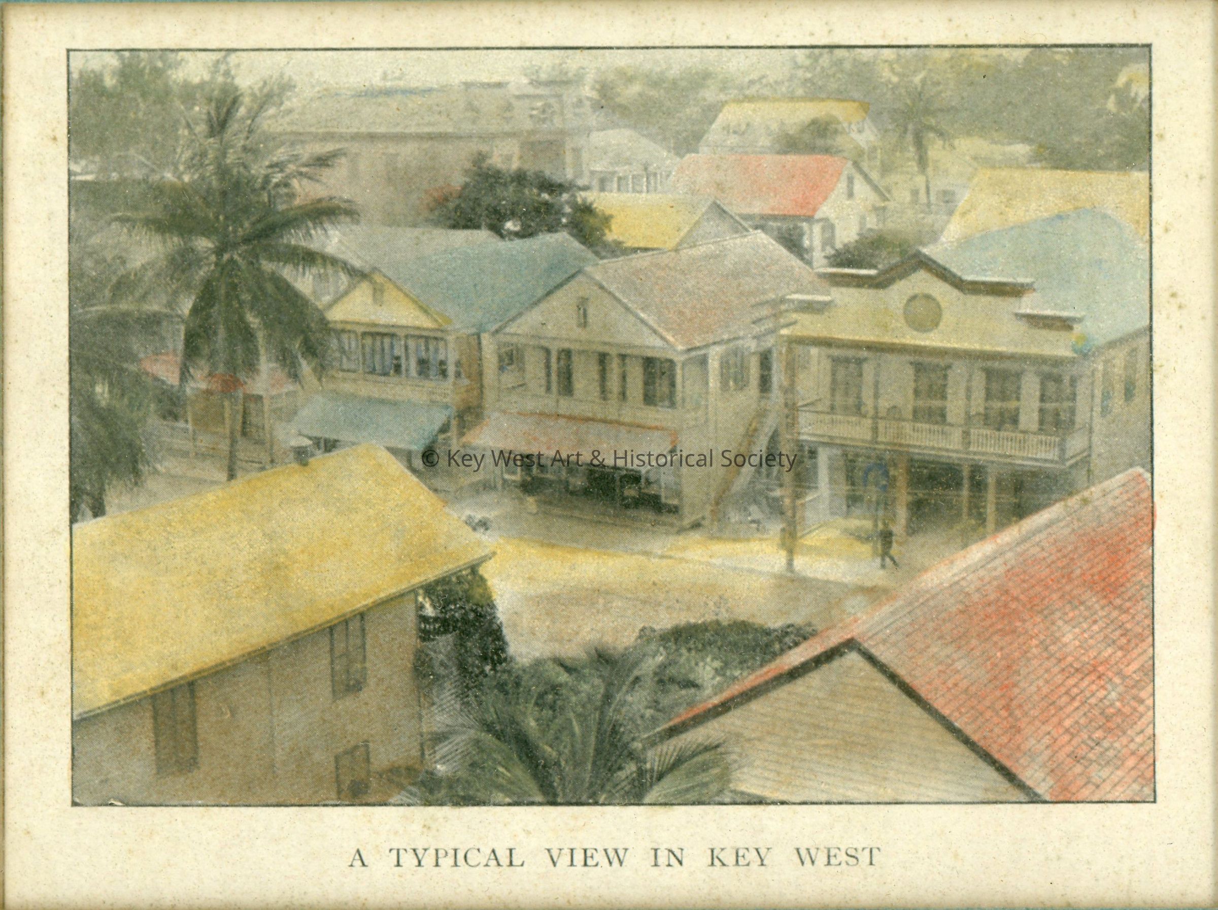 Framed print of a hand tinted photograph titled 'A Typical View in Key West' from 'Harper's Pictorial History of the War with Spain.' The print shows a view from on high of businesses and homes alongside palm trees.Artwork Details