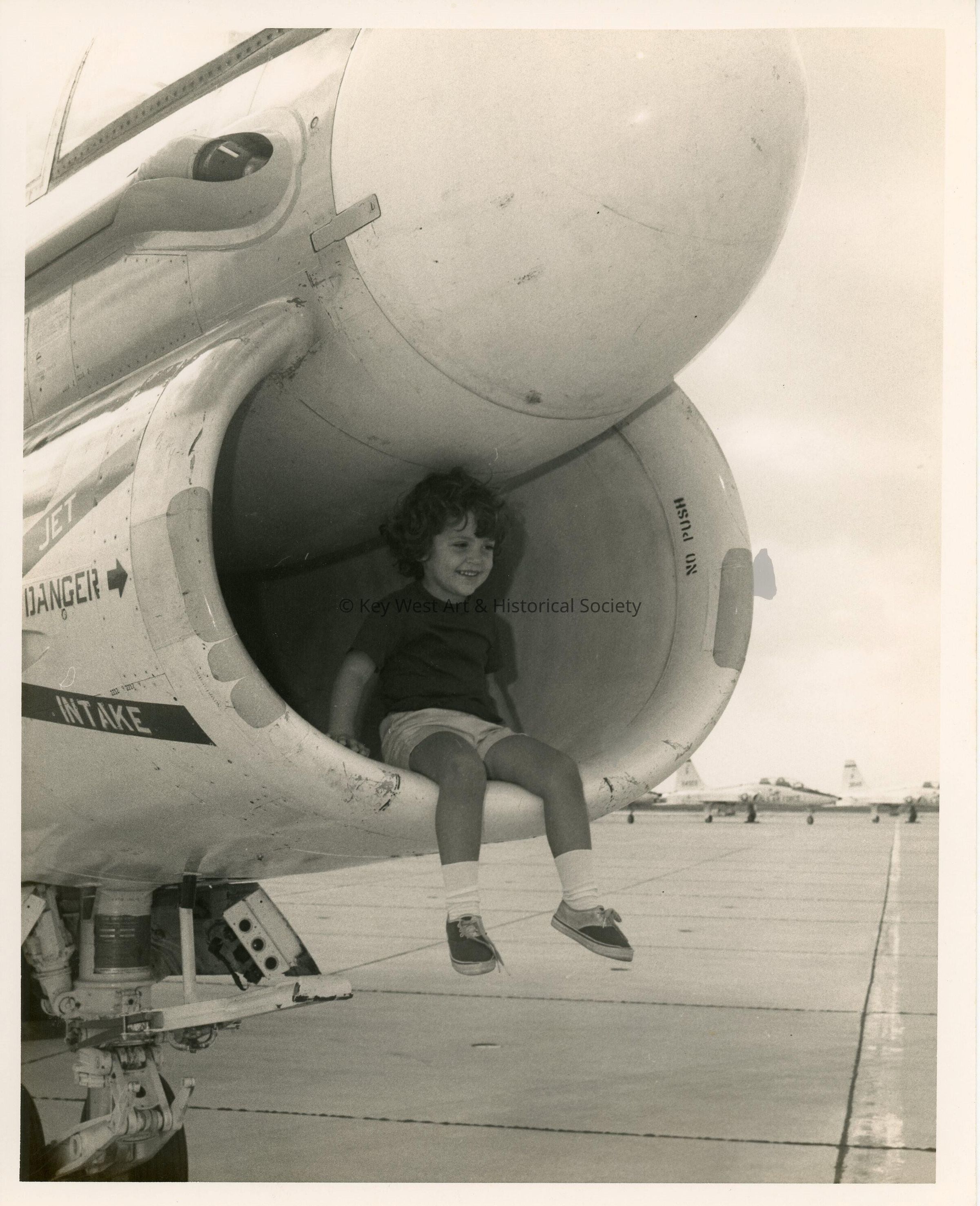 A U.S. navy jet with a child sitting inside