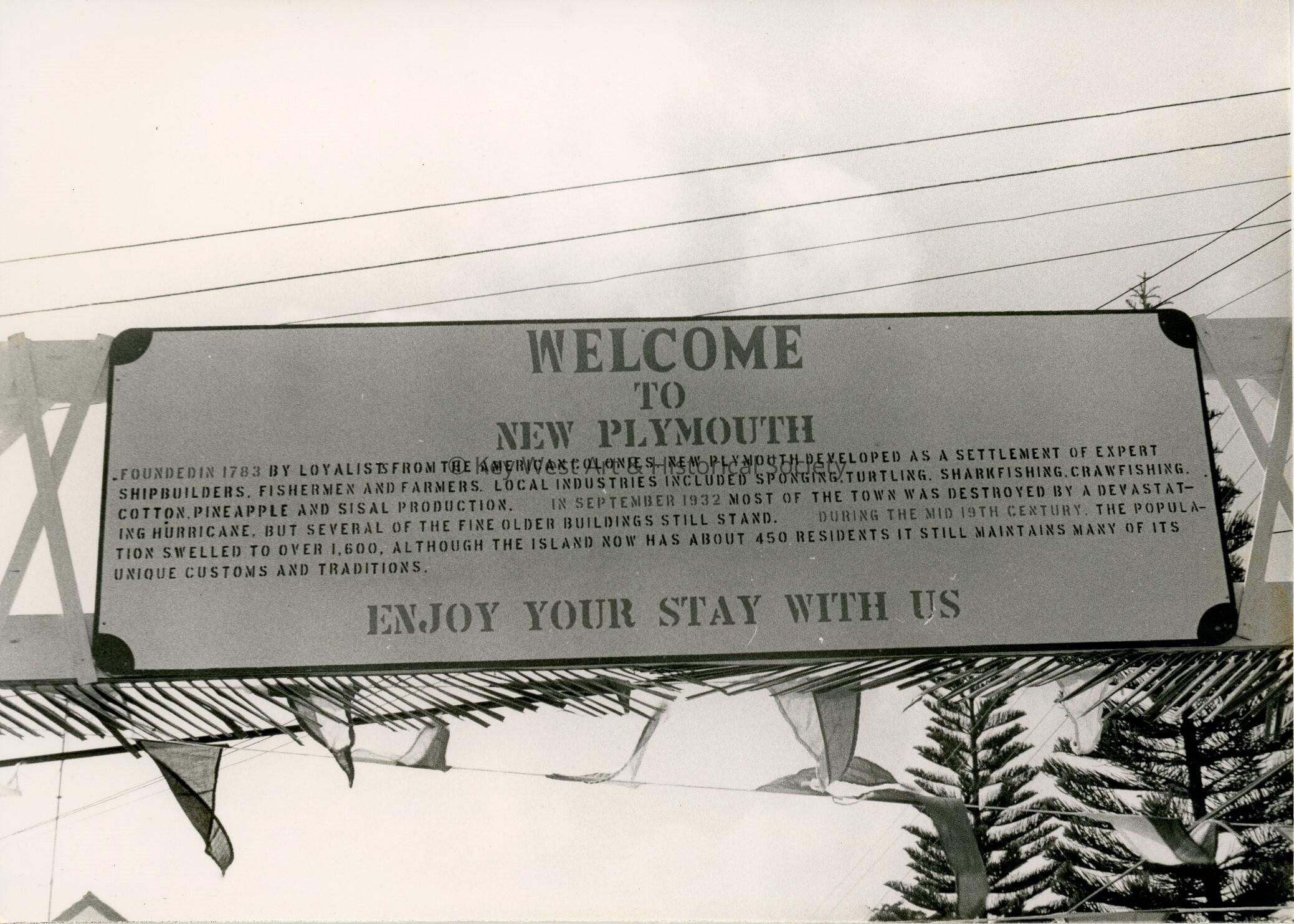 Black and white photograph of the 'Welcome to New Plymouth' sign hanging in Green Turtle Cay, Abaco, Bahamas