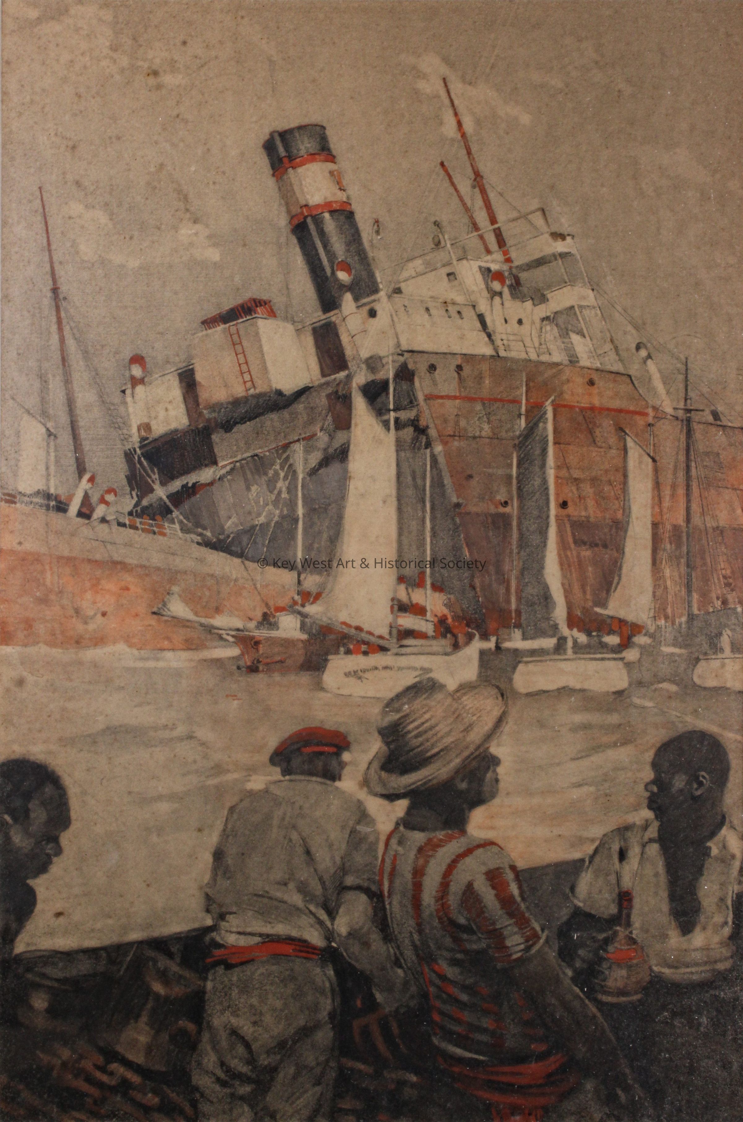 Mixed media drawing on paper laid down on board by George Harding depicting Florida Keys wreckers coming to the aid of a steamship hung up on the reef. This drawing served as the title illustration for 'Wreckers of the Florida Keys' published in Harper's Magazine, July 1911. An inscription, as well as printing instructions, appear in pencil on the verso.Type of Drawing