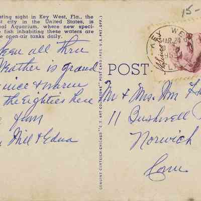 Postcard depicting the Municipal Aquarium in Key West, Florida. "An interesting sight in Key West, Florida, the southernmost city in the United States, is the Municipal Aquarium, where new specimens of the fish inhabiting these waters are added to the open-air tanks daily."Collection