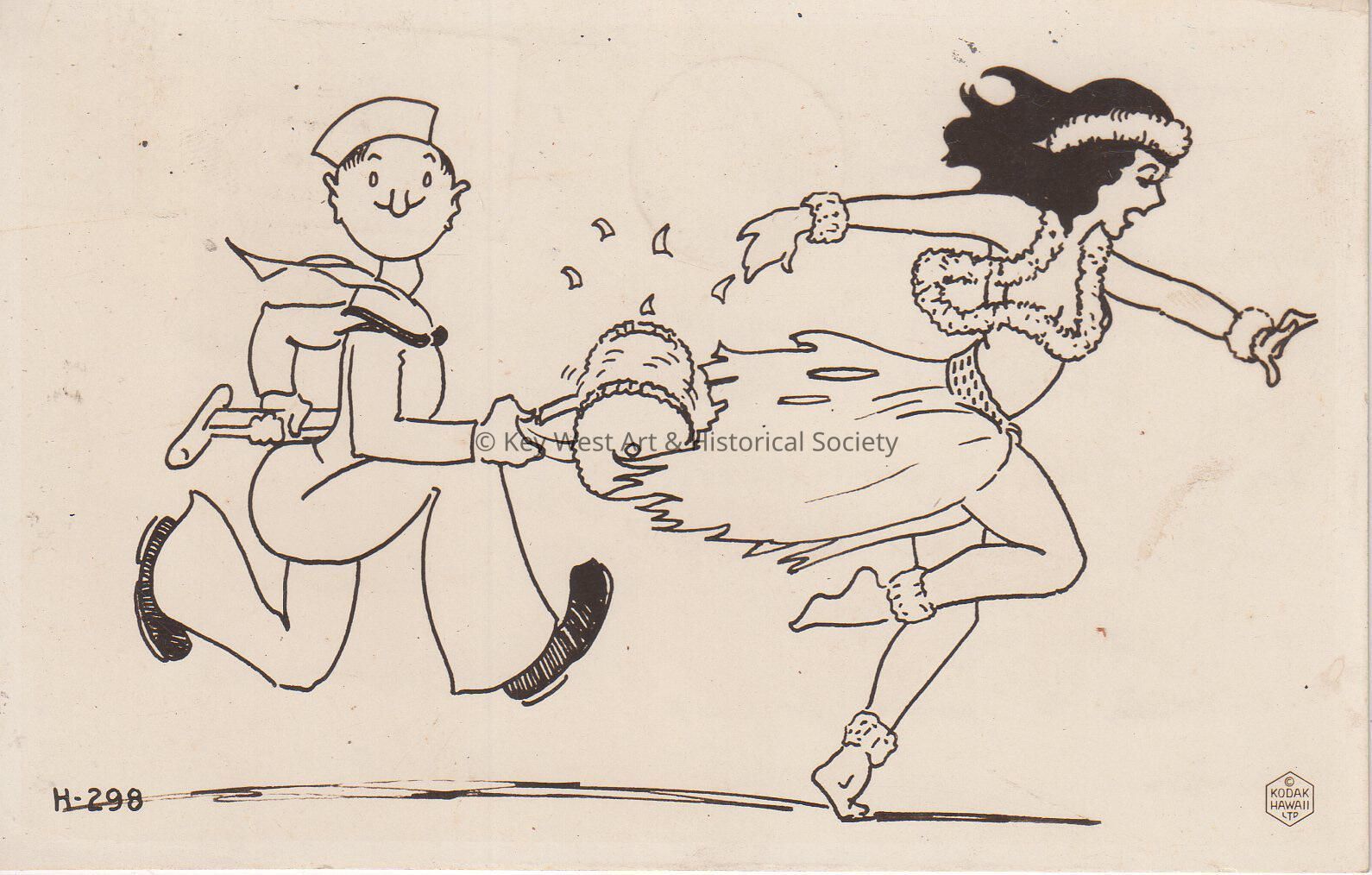 Postcard depicting a cartoon of a sailor chasing a hula girl with a lawnmower. The message on the verso reads, 'April 13, 1940, Darling, Just a line from Honolulu, Hawaii. Having a wonderful time, wish you were here. Miss you alot. Love you more than ever. Give my best regards to your folks. Answer soon. Love, George, U.S.N.' The card is addressed to Miss Ronnie Vetron, 2840 South Warnock Street, South Philadelphia, Pennsylvania, U.S.A., and is postmarked Honolulu, April 13, 1940.Collection