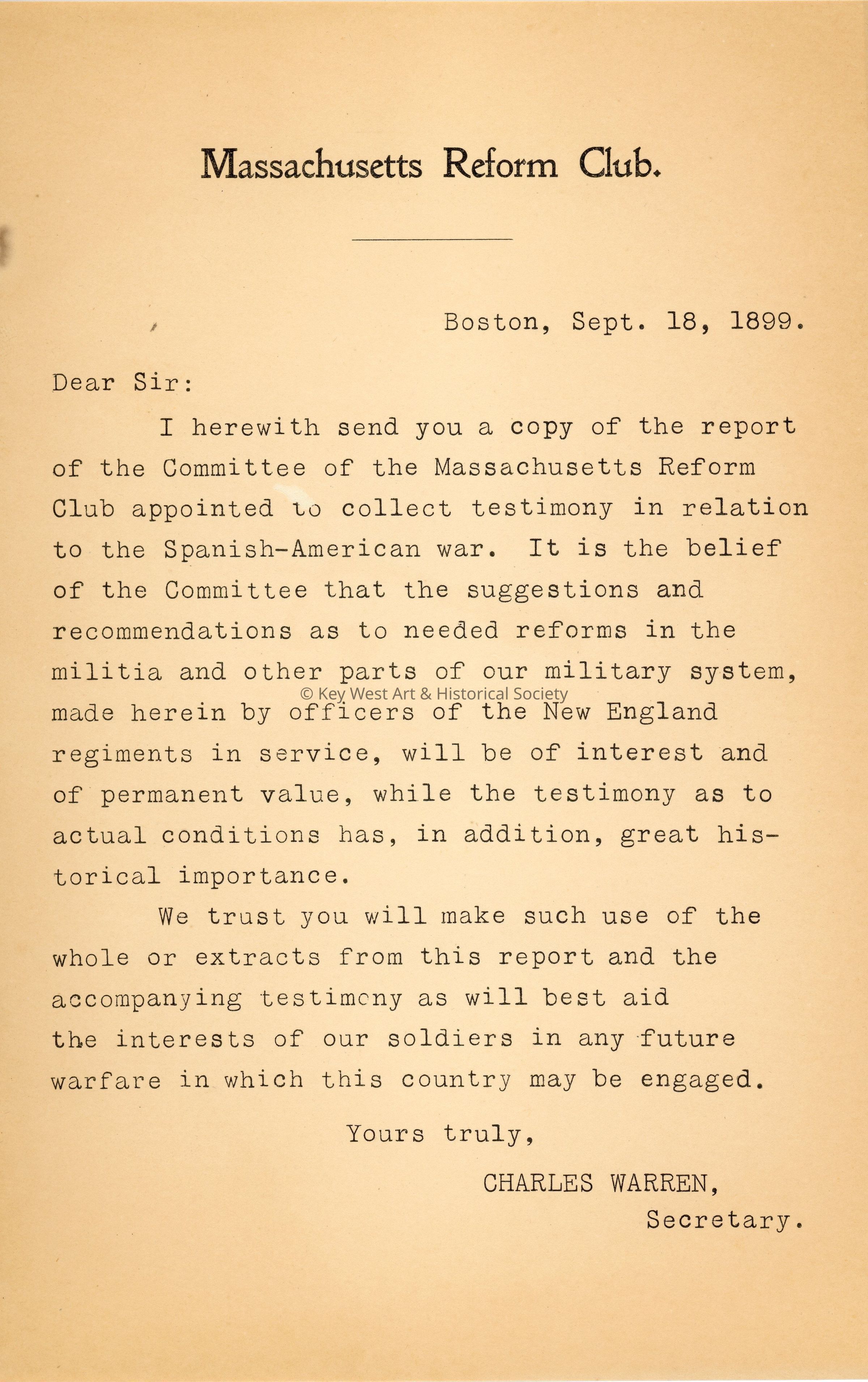 The report of a five man 'War Investigation Committee' that interviewed military personnel and civilians involved with the Spanish-American War in order to better understand how to improve the military and future war efforts.Collection