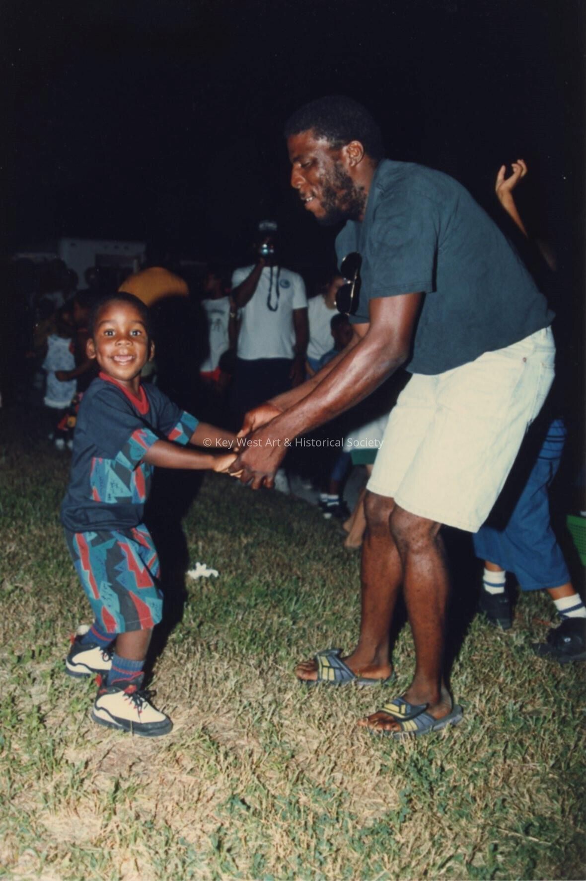 Unknown man and child dancing at the Goombay celebration.Entry/Object ID
