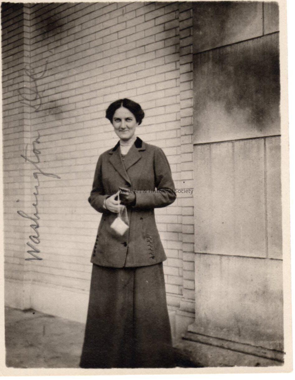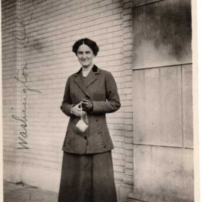 Black and white photo of a woman wearing a long skirt and a suit jacket standing in front of a brick wall. Caption on side of photo reads Washington D.C. Photograph taken for the Blackstone Gas and Electric Company.Collection