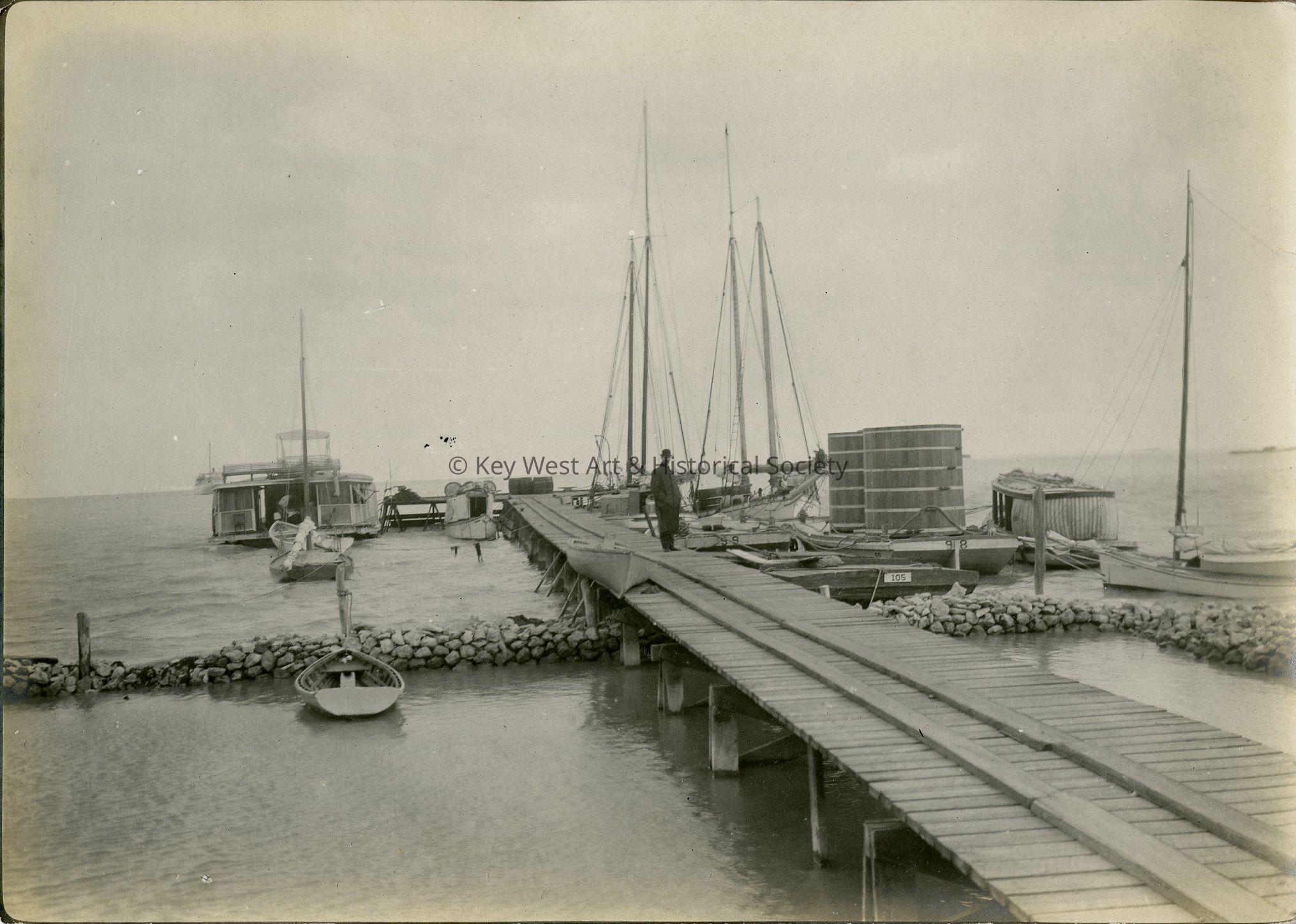 Black and white photograph depicting the construction of the Oversea Railway. The image shows Lummus' Dock in Key West Bight on April 2, 1907.