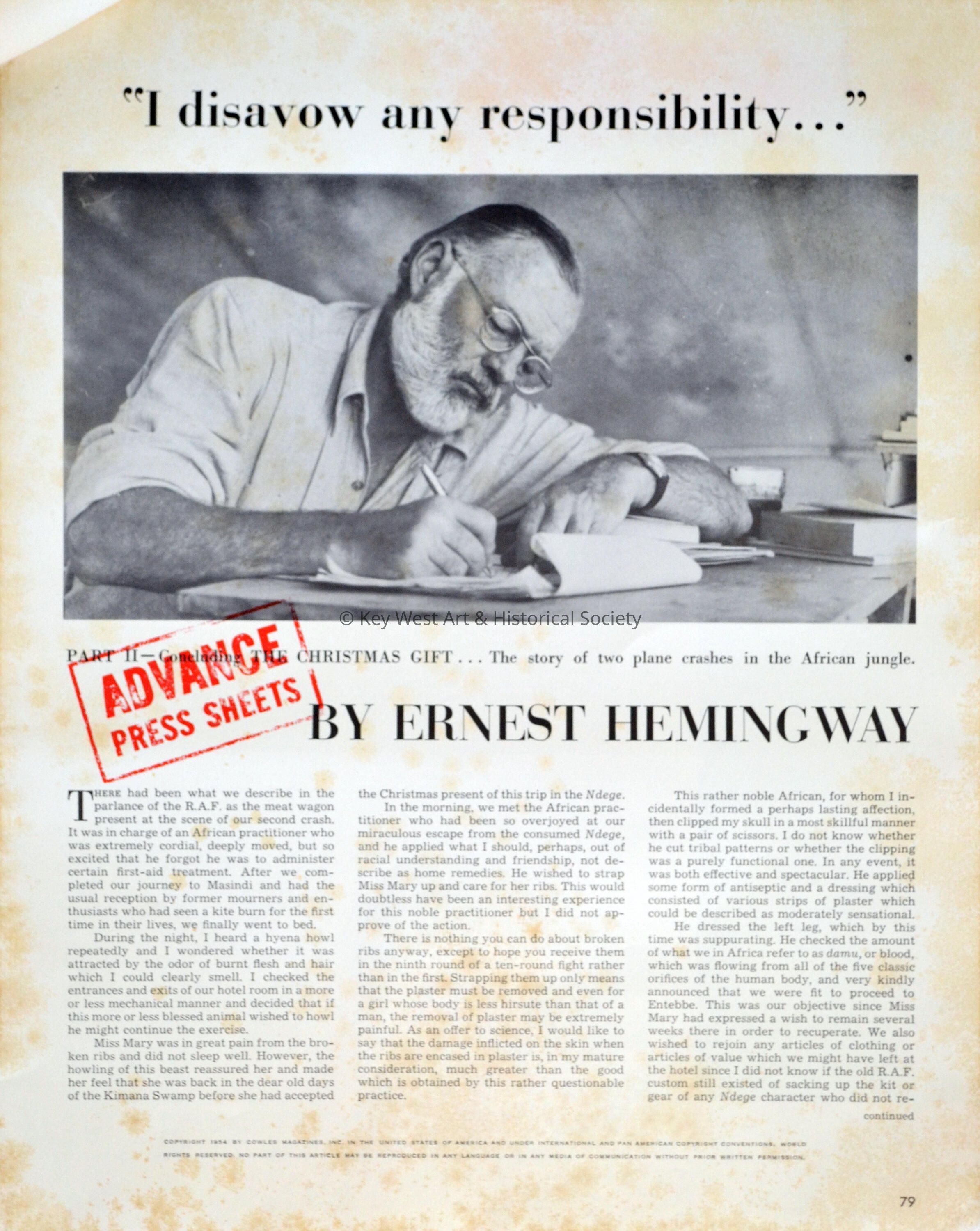 Ernest Hemingway Advance Press Sheets 'Part II - Concluding the Christmas Gift...The Story of Two Plane Crashes in the African Jungle'Entry/Object ID