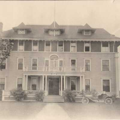 Black and white photograph of an unknown three story house and car. Photograph taken for the Blackstone Gas and Electric Company.Collection