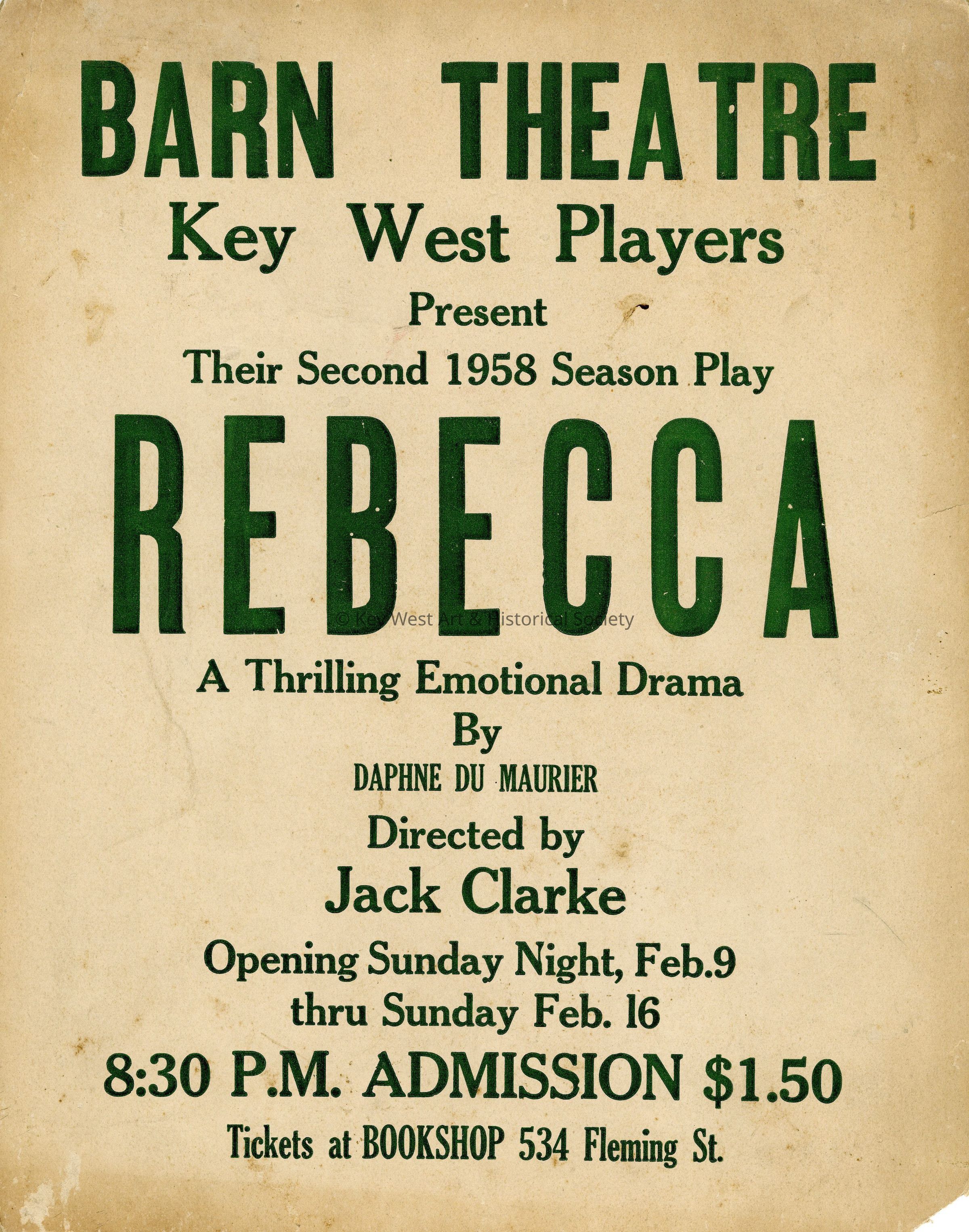 Theater lobby poster from Red Barn Theatre and Key West Players' presentation of 'Rebecca' in 1958. It was the second play produced that season.
