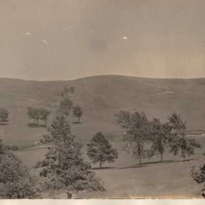 Black and white photo of hills and fields with trees.