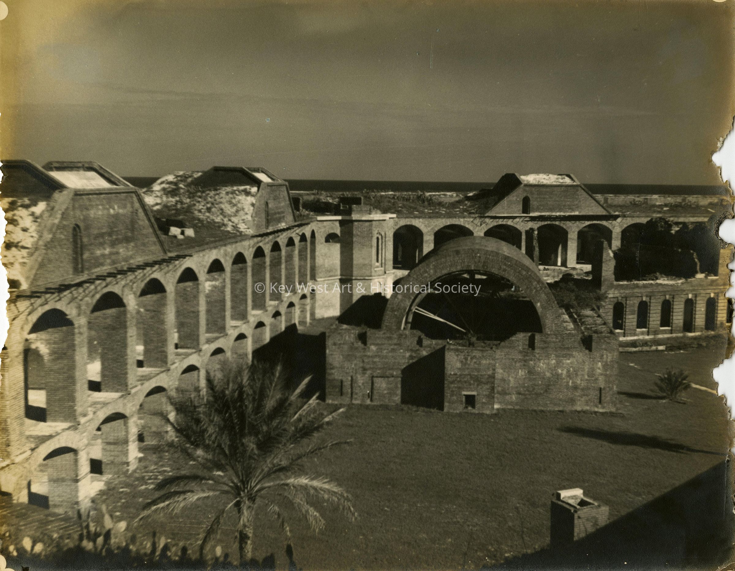 Black and white photograph showing the parade grounds and the large magazine at Fort Jefferson in the Dry Tortugas.