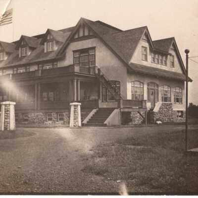 Black and white photograph of an unknown building with an American flag in the background.Collection