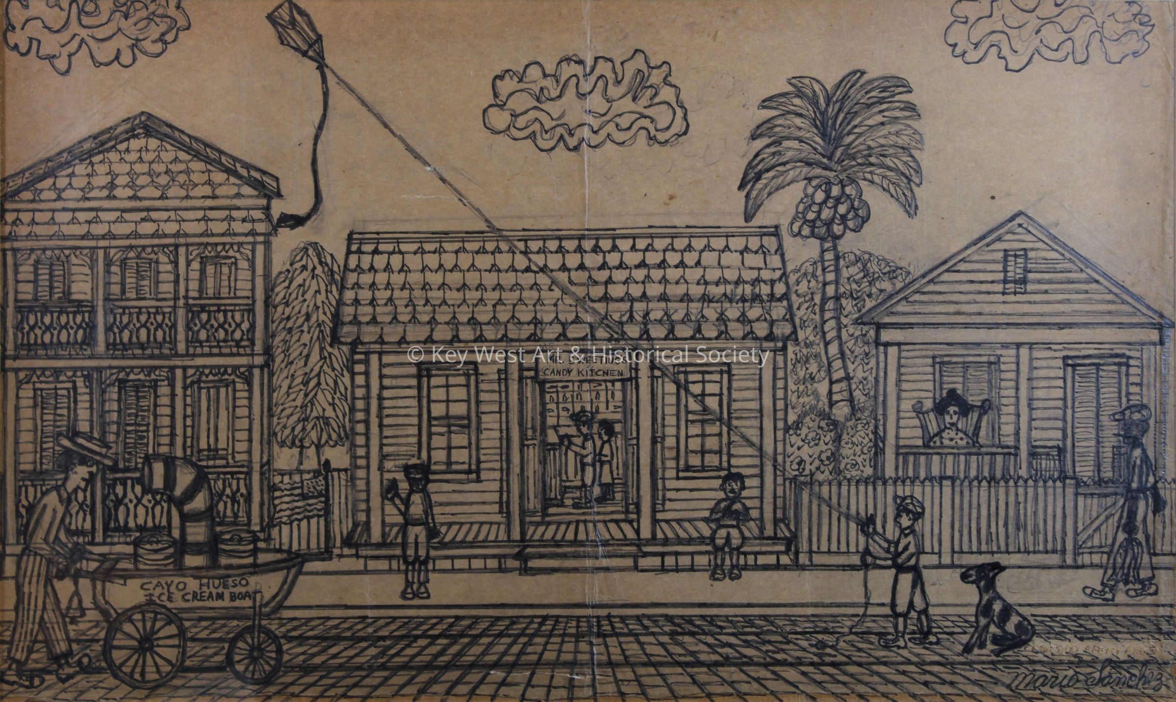 Caption written by Sanchez reads, 'The two story house was on Duval Street next to Lillie and Rubin Appel's Dry Goods Store, where we lived during that time and right next to us was Mr. Sweeting's Candy Kitchen. These houses aren't there now. The lot is owned by the Appel's where they maintain a beautiful garden. I am flying a kite from the street and next to me is our dog Spotty.'Type of Drawing