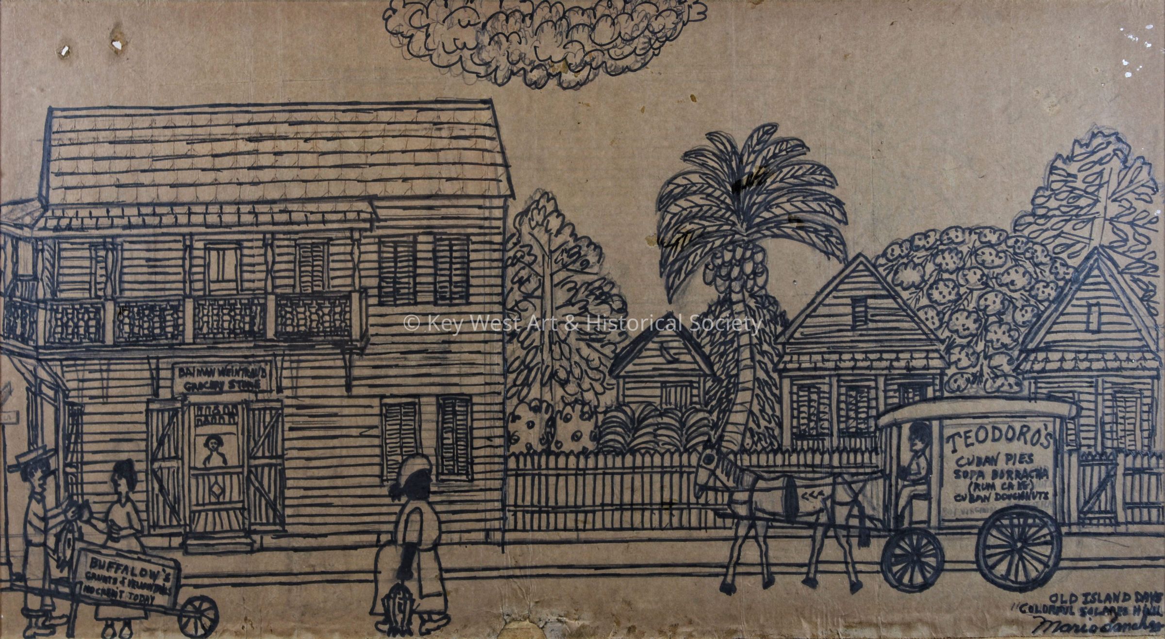Caption written by Sanchez reads, 'Weintraub's Grocery Store was on Angela and Elizabeth Streets. This house is still there. In the scene is a fisherman selling his fish and Teodoro's horse and wagon who delivered Cuban pies and Sopa Borracha (rum cake) to the stores.Type of Drawing