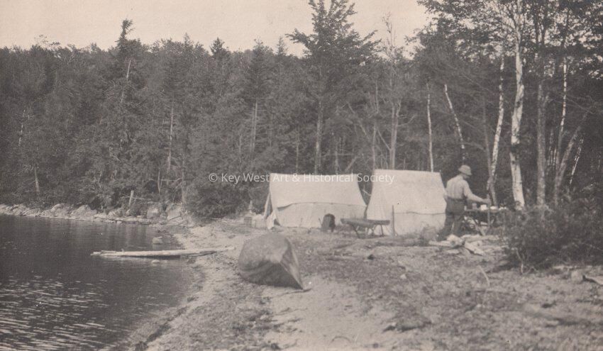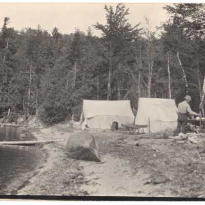 Black and white photograph of an unknown man with tents and a canoe on lakeshore.Collection