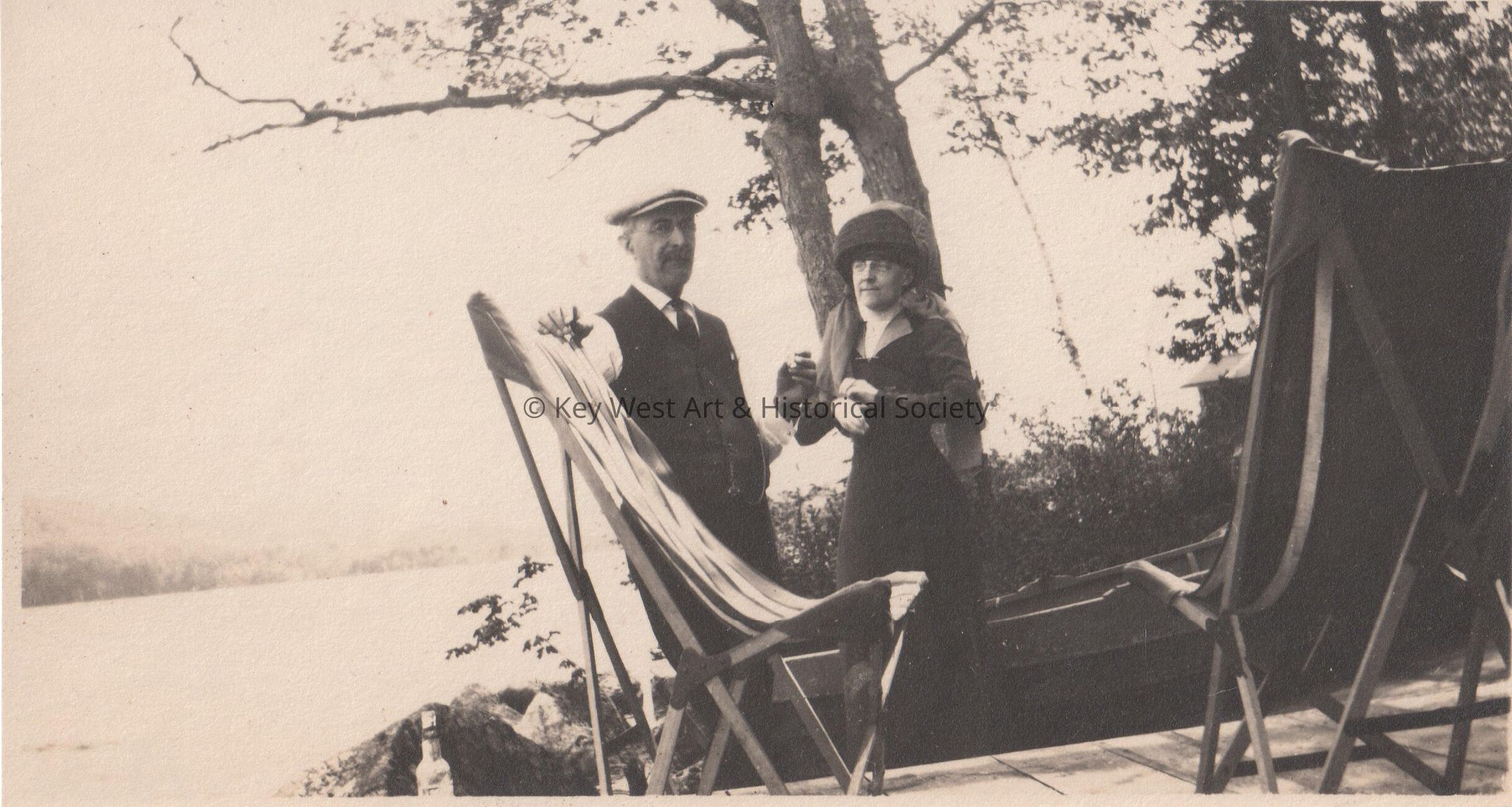 Black and white photograph of an unknown man and woman on a lakeshore.Collection