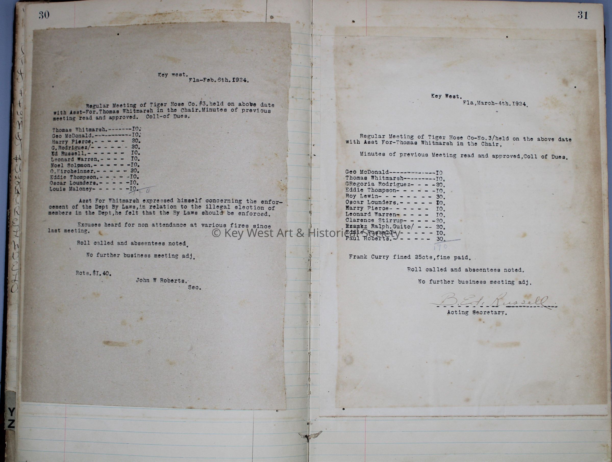 Minute book for Tiger Hose Company No. 3 of the Key West Fire Department. Includes member rosters and meeting minutes.