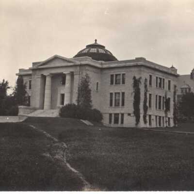 Black and white photograph of an unknown Neoclassical style building with a central rotunda.Collection