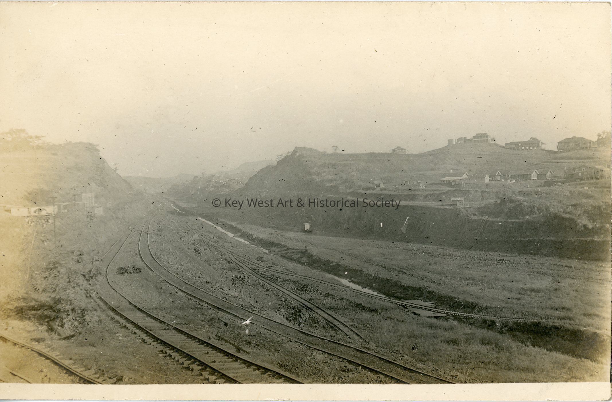 Black and white photograph postcard depicting the construction of the Panama Canal at the Culebra Cut, also known as the Gaillard Cut. The photo shows railroad tracks going through the center of the created valley and buildings on the hillsides. Postcard is addressed to Mrs. Geo. A. Balling.Subject