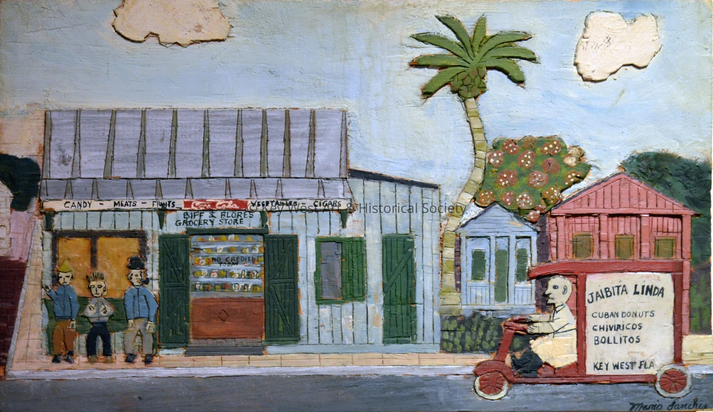 Wood carving by Mario Sanchez depicting Biff & Flores grocery store and Jaibita Linda delivery truck serving Cuban donuts, chiviricos and bollitos.Type of Sculpture