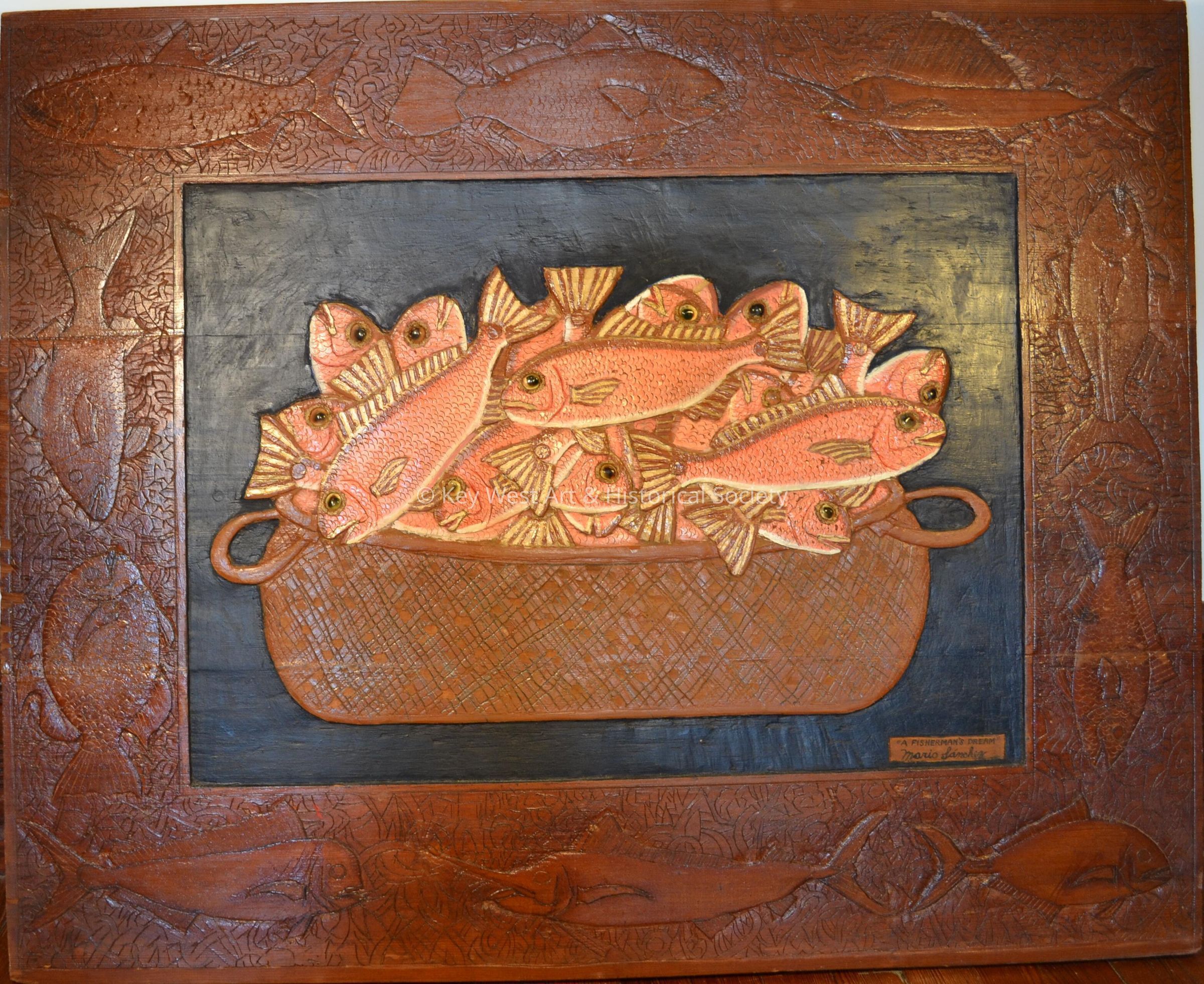 Caption in file reads, 'Fish caught off the coasts and reefs of the Florida Keys were Mario's first subjects for carved and painted boards. He began making them about 1930. "Nobody taught me how," he explains. "You know. Some people whittle. I carve fish..." He carved a tub full of Lane Snapper in this work, but other similar pictures carefully depict grunts, porgy, and other fish from Florida waters. Mario relates that during the Depression, many families, including his, lived on fish and cheap hominy grits. Rather than a memory of poverty, this image is a cornucopia of plenty, a reflection of the positive outlook of Mario's work.'Type of Sculpture