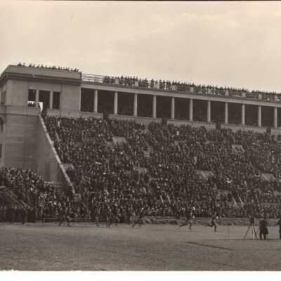 Black and white photo showing the stadium stands at the Harvard Yale football game.Collection