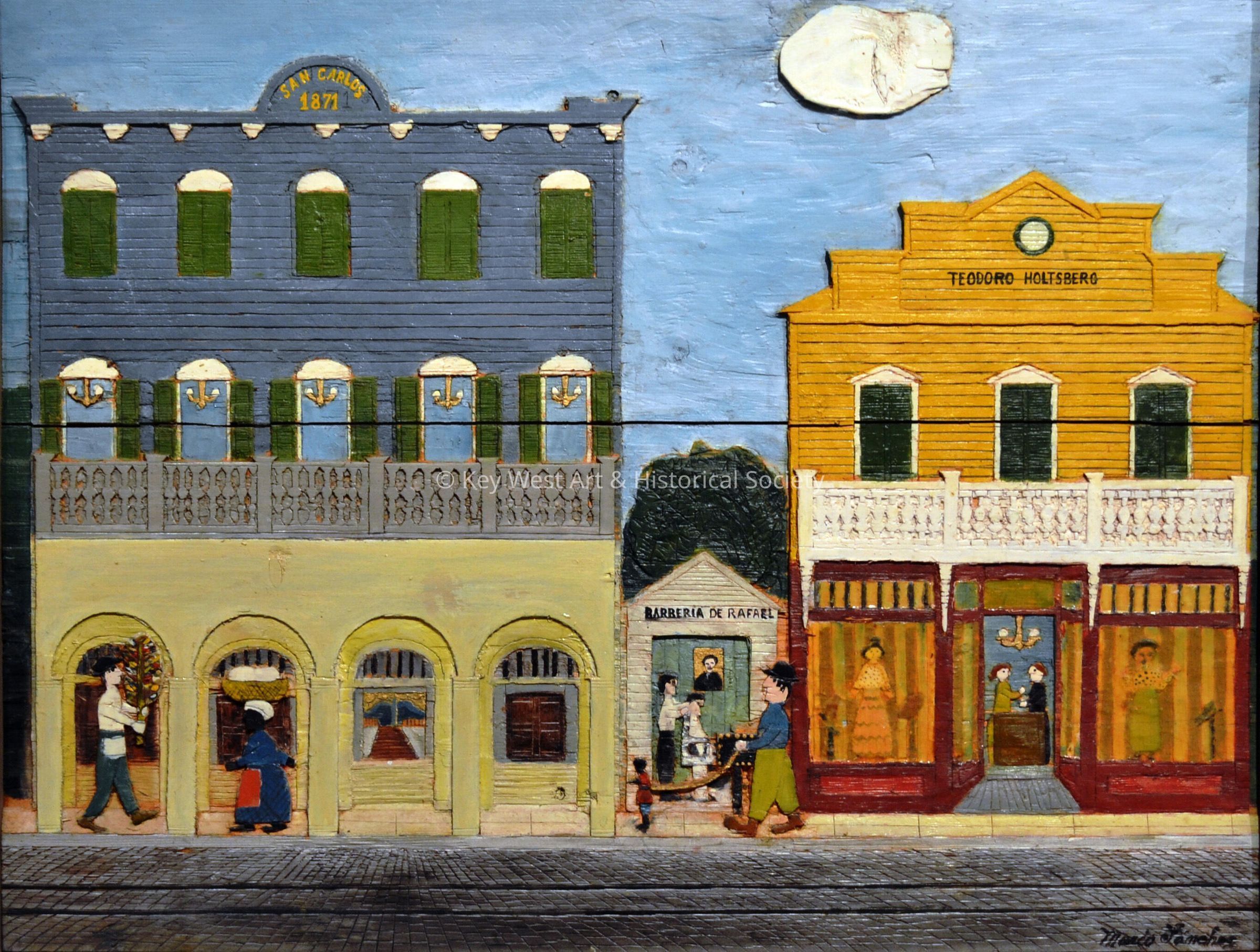 Wood carving by Mario Sanchez depicting the San Carlos Institute on Duval Street. Also visible are Barberia de Rafael and Teodoro Holtsbero. The Pee-roo-lee Man is walking down the street.