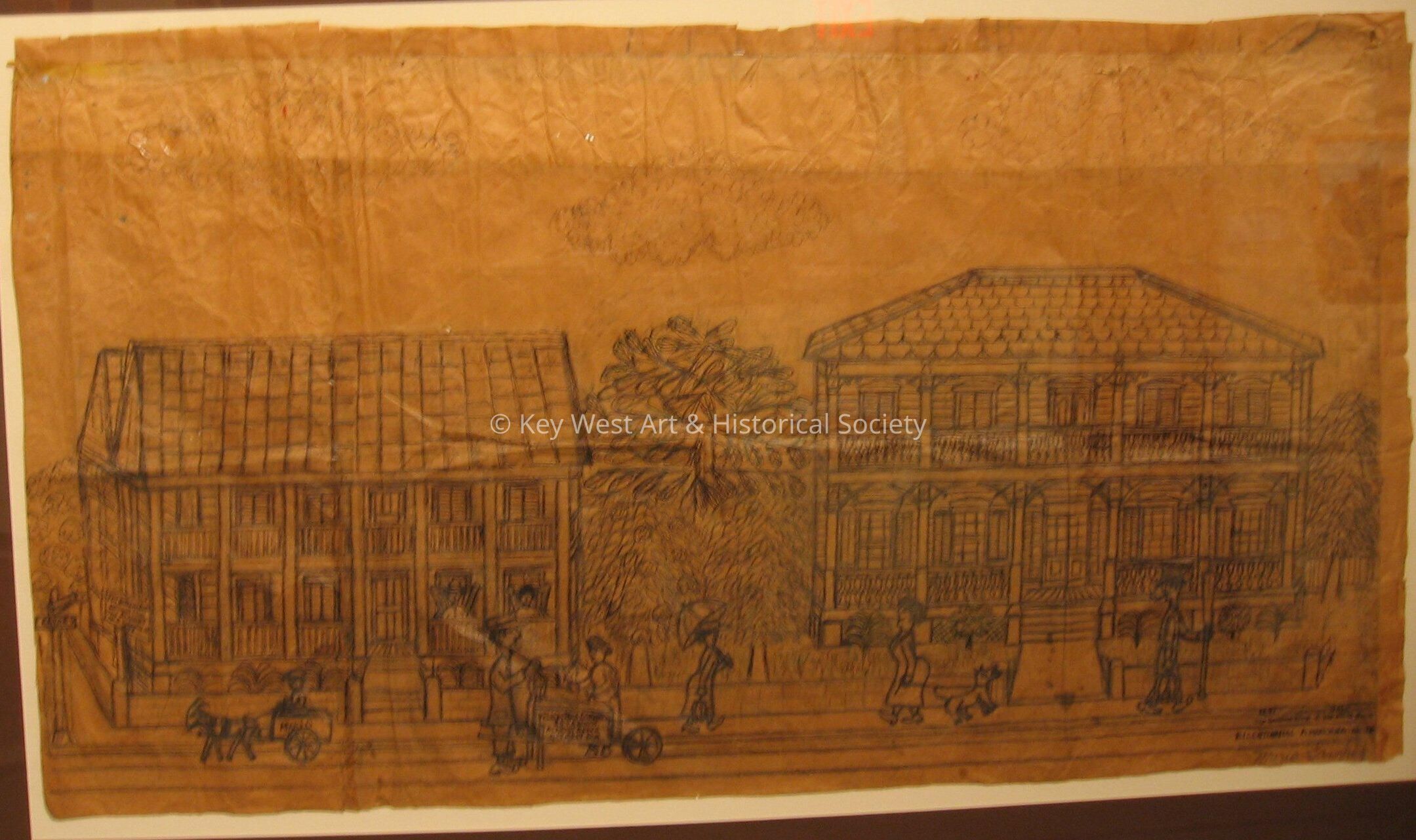 A second caption written by Sanchez reads, 'The house to the left of the scene is The Bahama House, brought from the Bahamas on a barge. The house to the right is the old Filer house, which is now owned by Sheriff William Freeman. I am the driver on the cart drawn by a goat.'Type of Drawing