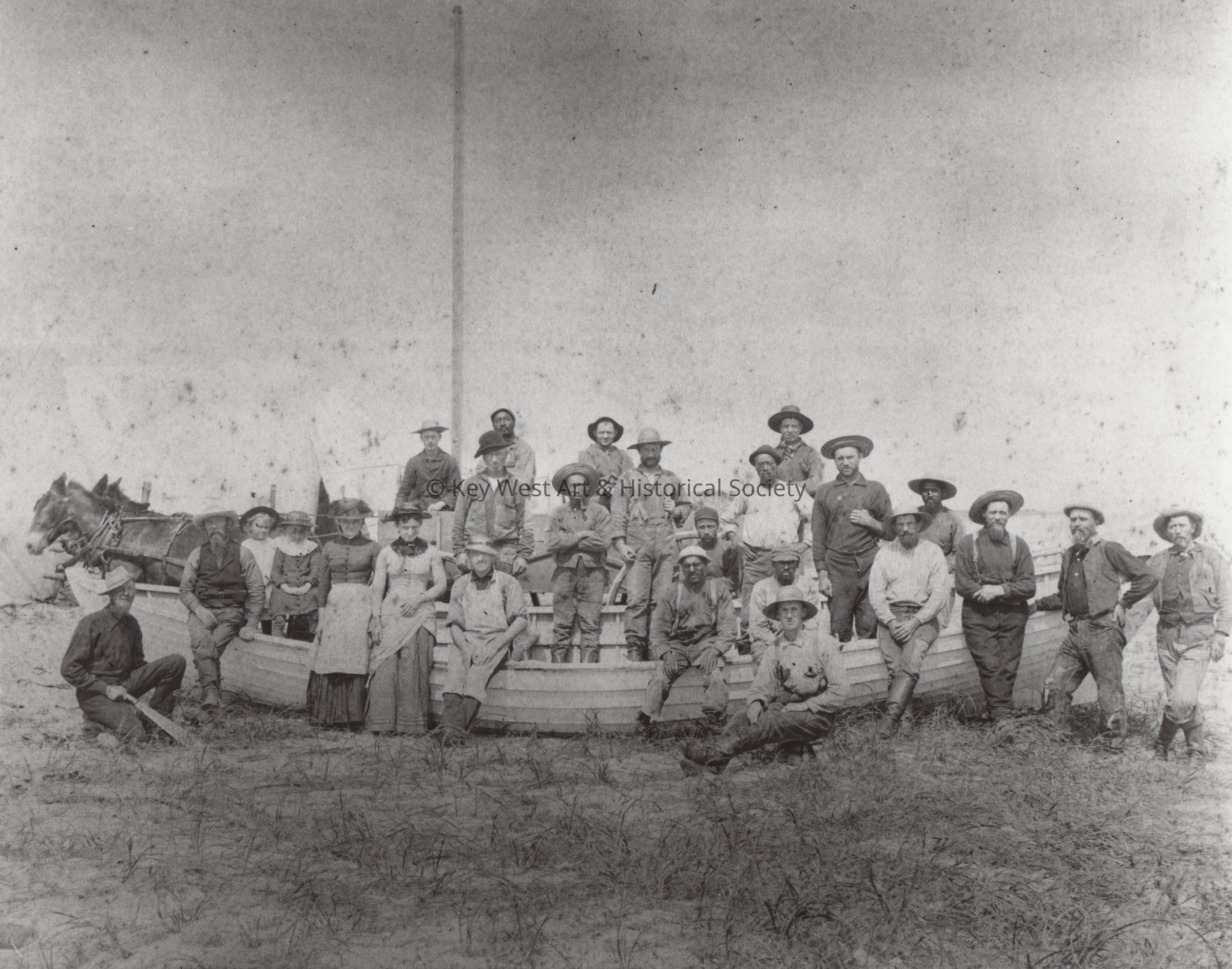 Black and white photograph of an unknown group of men and women with a boat.Collection