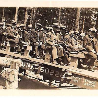 Black and white photograph of unknown group of men on benches (and possibly on a train car).