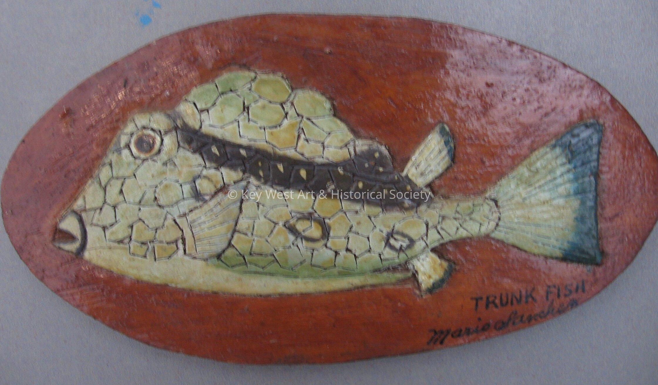 Wood carving by Mario Sanchez depicting a trunk fish.