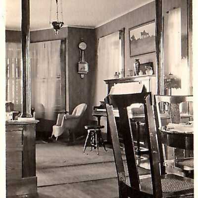 Black and white photograph of an unknown room, note on back reads "looking across the dining room into living room".